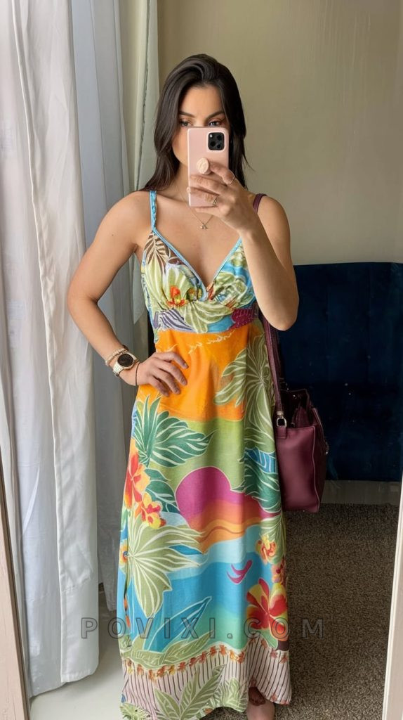 Nothing screams summer quite like a colorful, tropical-print dress. The bold hues and duo of bright floral patterns create a lively and energetic vibe, perfect for resort wear or a fun beach party. The lightweight fabric ensures comfort, while the fitted bust and flowing skirt enhance your figure. Style it with a structured handbag and delicate layered necklaces for a balanced outfit non vip look that is both trendy and practical.
