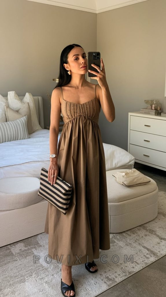 For those who love understated elegance, this earthy brown maxi dress is a theme in itself. With its corset-inspired bodice and flowing fabric, it offers a flattering silhouette perfect for an evening dinner or a classy cocktail event. Style it with black strappy heels and a striped clutch for a contemporary take on neutral dressing. The beauty of this look lies in its versatility – ideal for both formal and casual settings.