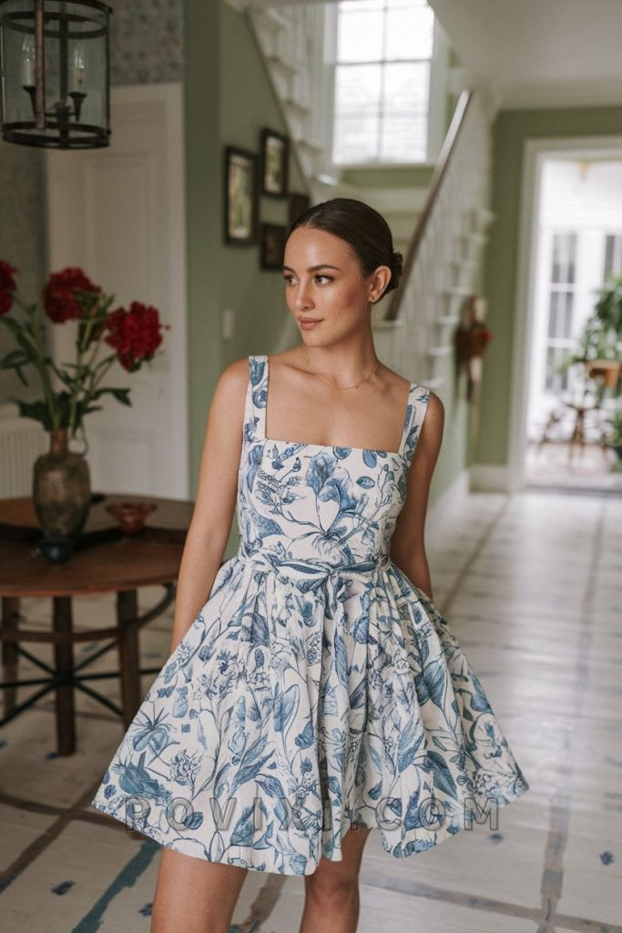 For lovers of timeless floral outfit ideas, this blue-and-white printed midi dress is a must-have. The fitted bodice and flowing skirt create an effortlessly romantic vibe. Style it with nude heels and minimal accessories for a vip look that’s perfect for summer gatherings. For added elegance, layer it with a lightweight linen blazer and pearl earrings. The classic floral print ensures this dress remains a summer staple for years to come.