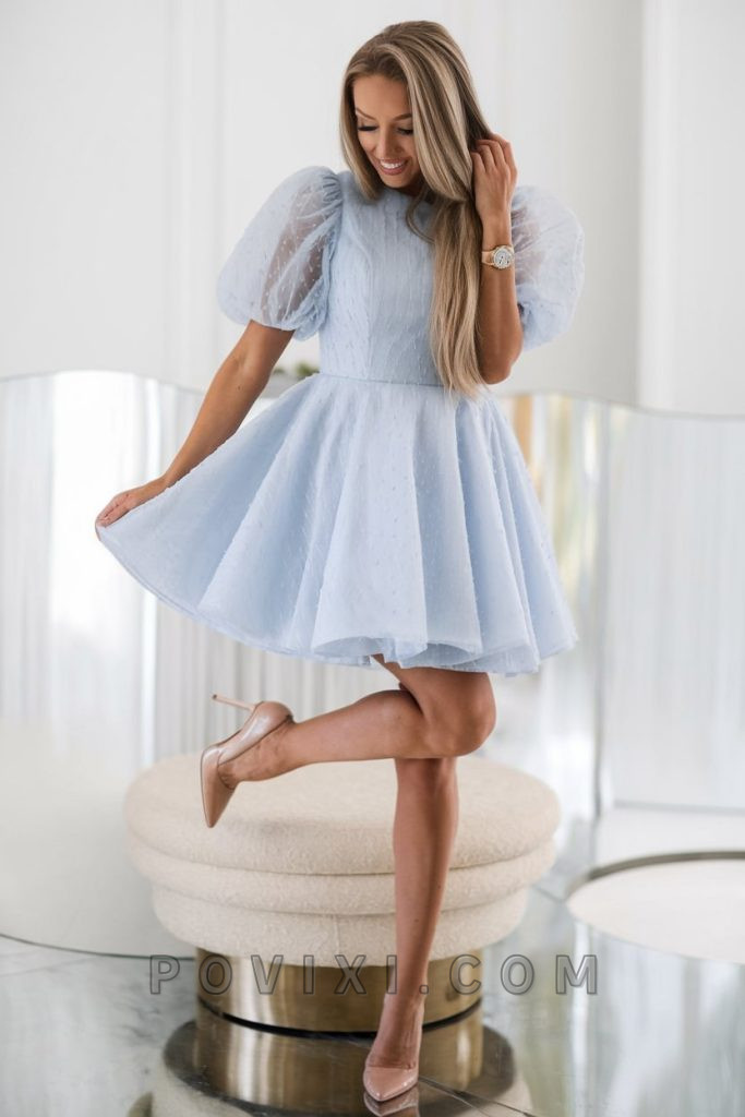 Pale blue with puffed sleeves, this dreamy dress is straight out of a fairytale. The tiered skirt adds volume, creating an ethereal look that is perfect for summer weddings or date nights. This outfit theme is ideal for those who love cute and feminine fashion. Pair it with nude pumps and a delicate bracelet to maintain a soft, elegant feel.