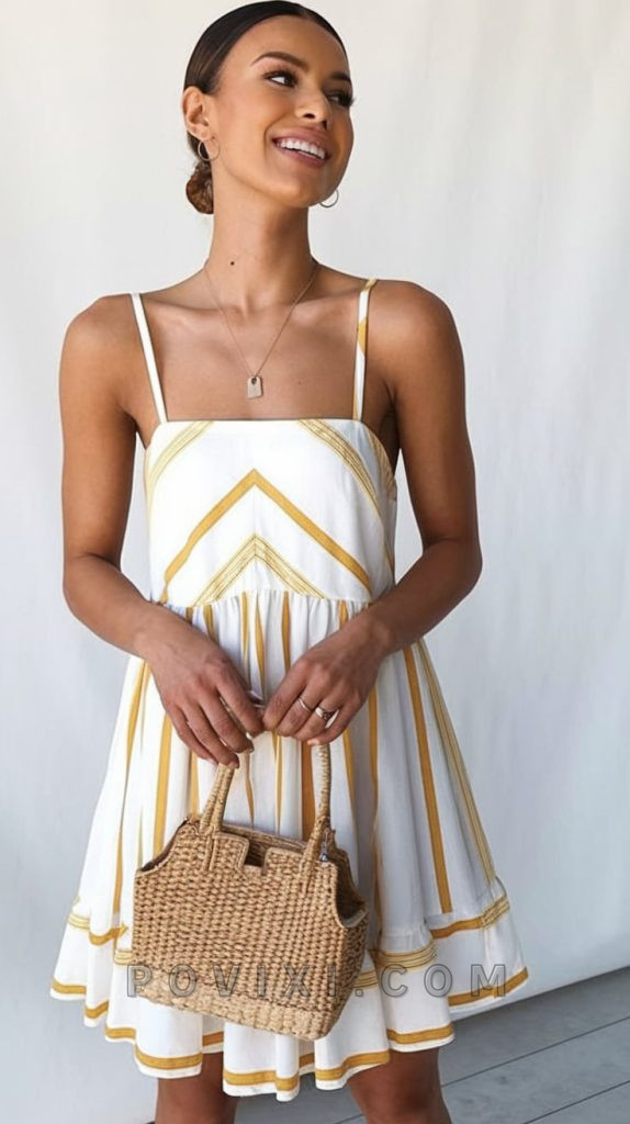 This white and mustard yellow sundress embodies easygoing summer elegance. The brat aesthetic, with delicate straps and an empire waist, makes it a go-to for both relaxed weekends and stylish outings. A woven handbag and gold jewelry add a touch of sophistication to this outfit theme. Whether styled with leather sandals for a casual look or paired with wedges for an upscale dinner, this duo of comfort and charm makes it a wardrobe essential.