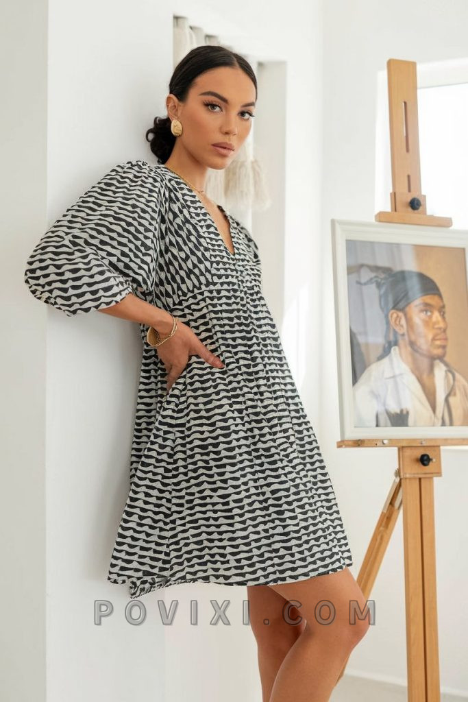 Minimalist yet striking, this black-and-white printed tunic dress is a dream for those who appreciate understated elegance. The voluminous sleeves and V-neckline add a touch of drama, while gold accessories elevate the ensemble. Wear this look for a free spirit vibe that commands attention without trying too hard. The loose silhouette makes it ideal for hot summer days, while ankle boots or strappy sandals can add personality to the look. This outfit perfectly balances modernity and tradition, making it a standout choice for any occasion.