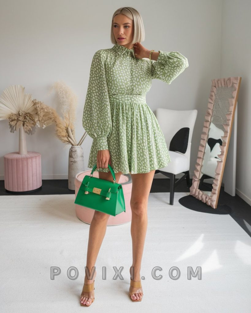 For those who love a structured silhouette, this green printed mini dress with long sleeves is a standout. The cinched waist and voluminous sleeves add drama, while a bold green handbag completes the power duo of elegance and statement dressing. This look is perfect for fashion-forward professionals or stylish women who love to blend playfulness with sophistication. Pair it with block heels for a brat aesthetic, or keep it simple with ballet flats for a relaxed yet chic approach.