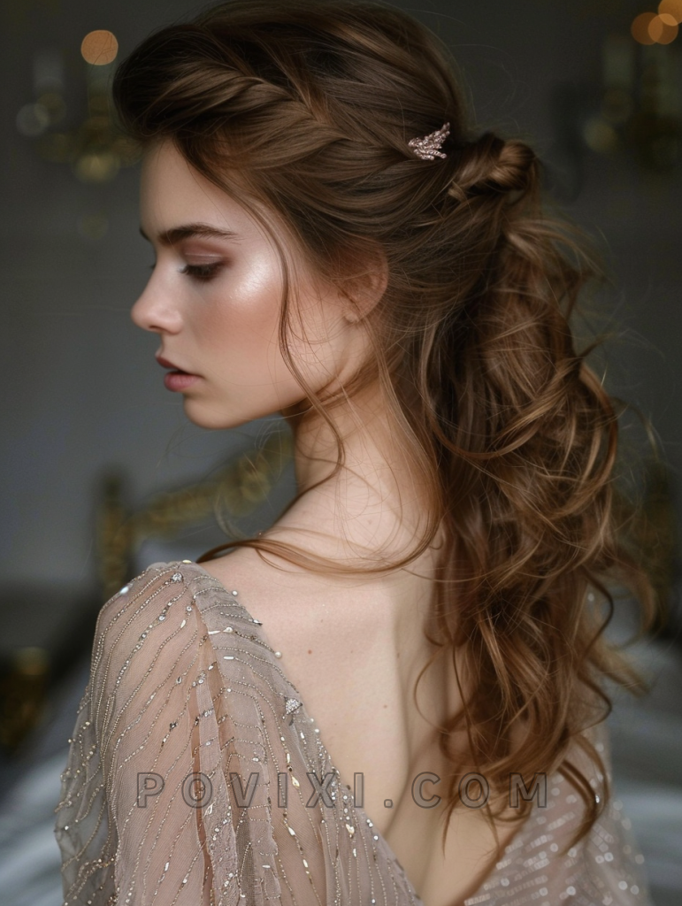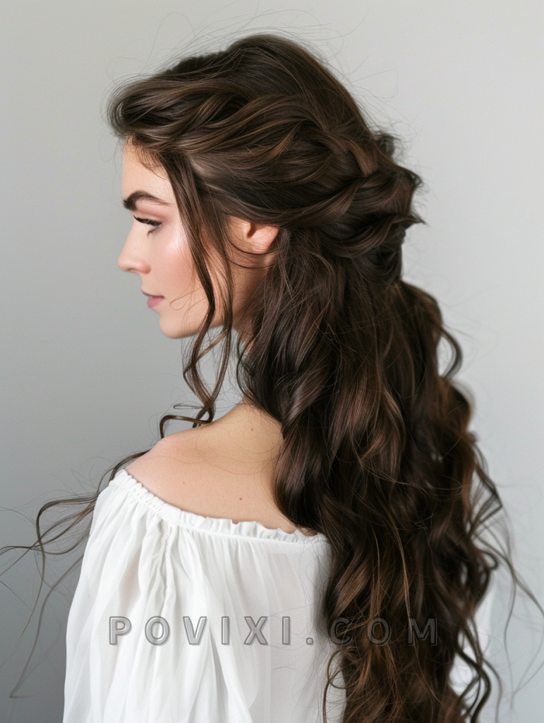 For achieving this ethereal look, use a large-barrel curling iron to create loose waves, then sweep them to one side. Secure with bobby pins in a matching hair color and finish with a light mist of hairspray to maintain movement. Use a hydrating conditioner to keep your waves smooth and lustrous.