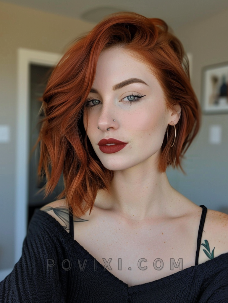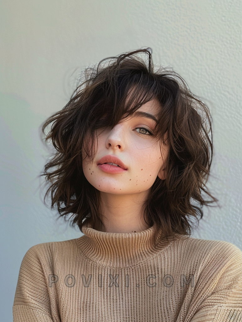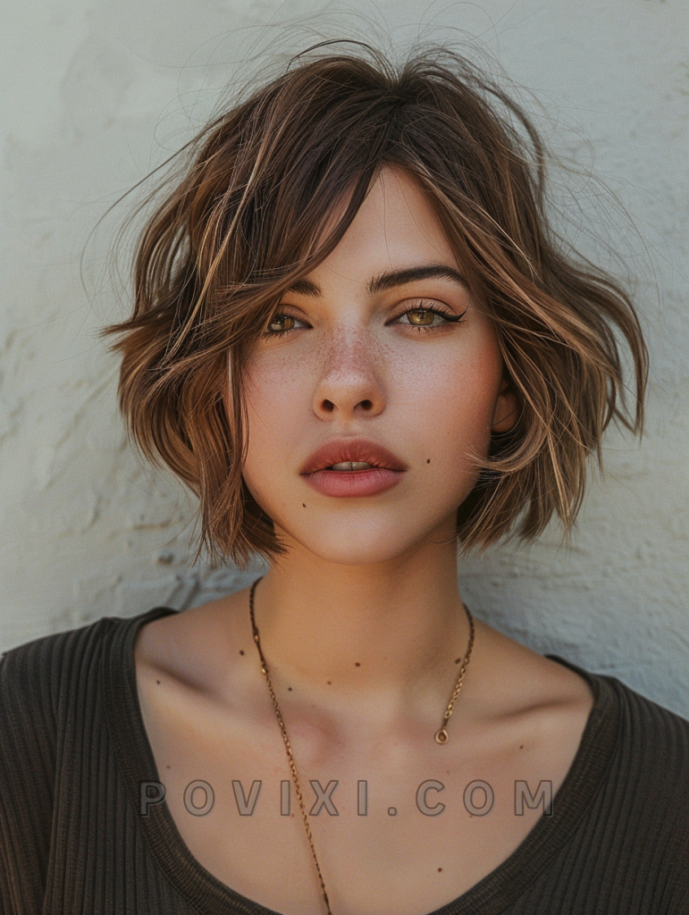 The shaggy bob is a fun and relaxed style that adds movement and texture to the traditional bob. This cut features choppy layers and a tousled finish, creating a carefree and youthful look. It’s perfect for casual outings and day-to-day wear, offering a laid-back yet stylish appearance. The shaggy bob suits oval and heart-shaped faces best, as it adds volume and enhances the natural structure of the face. Light-colored eyes, such as blue or green, are beautifully highlighted by this playful style.