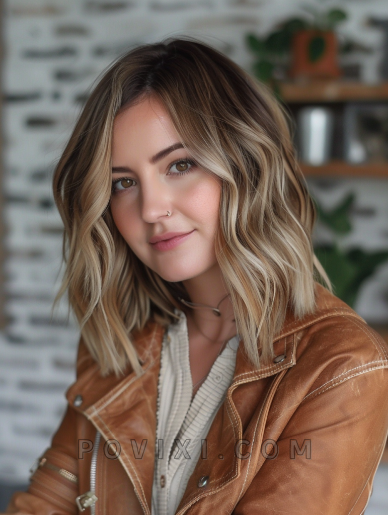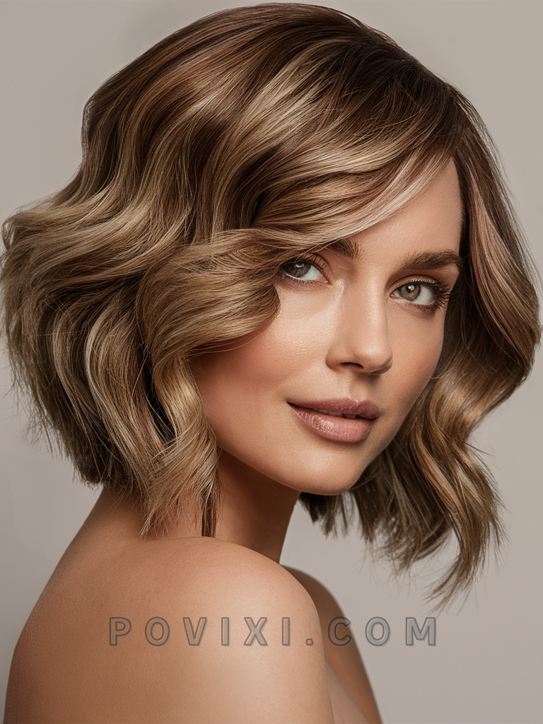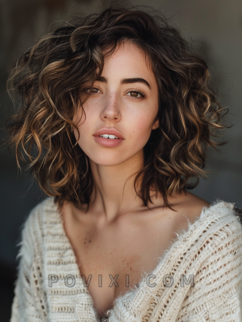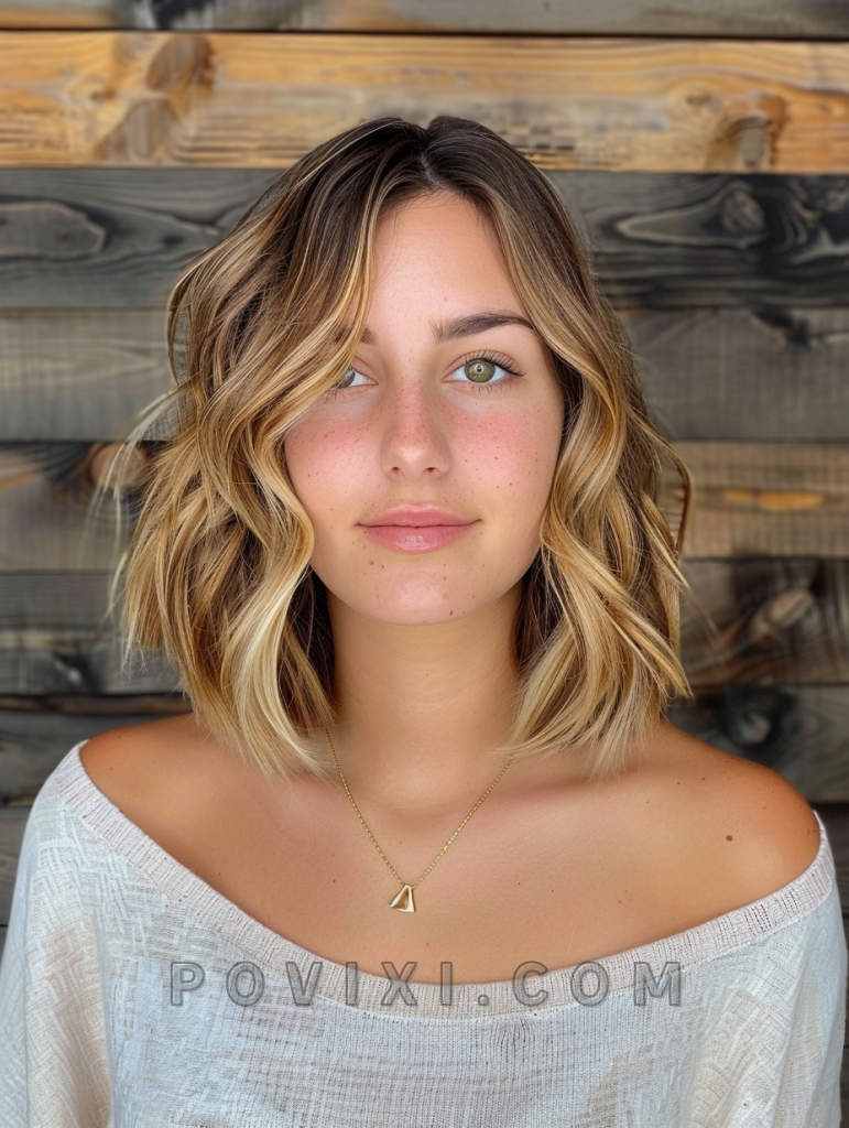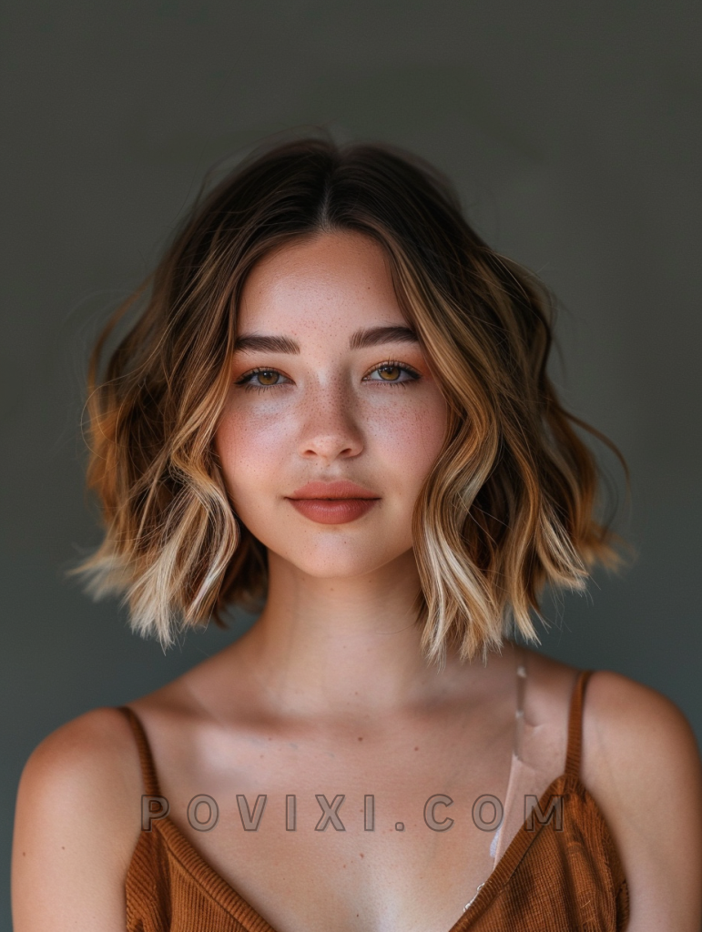 Embrace the natural waves of your hair with a wavy bob with highlights. This style combines the chicness of a bob with the playfulness of waves and the brightness of highlights. It’s a fantastic choice for casual and semi-formal occasions, offering a relaxed yet polished appearance. This haircut is especially flattering for oval and diamond-shaped faces, as the waves soften the angles and highlight the cheekbones. Brown or hazel eyes are beautifully enhanced by this style.