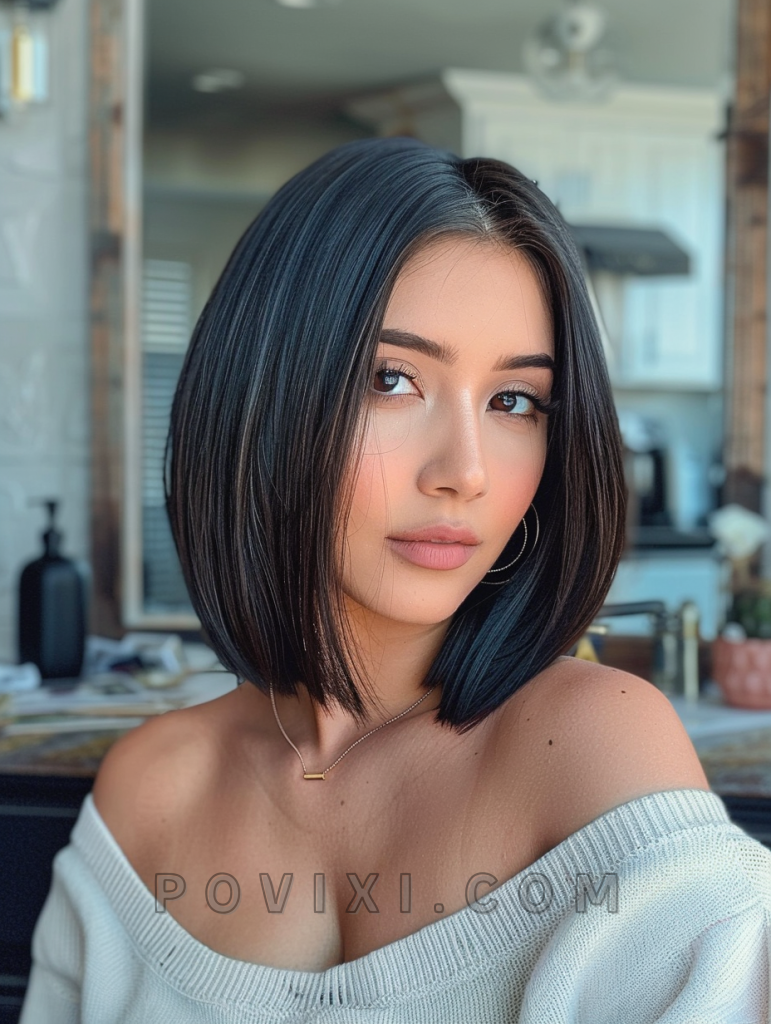 For a minimalist and sophisticated look, the sleek bob with middle part is an excellent choice. This style features straight, even lengths with a precise middle part, creating a clean and polished appearance. It’s perfect for professional settings and formal events, offering a refined and elegant look. The sleek bob with middle part suits oval and diamond-shaped faces best, as it highlights their symmetrical features. Dark eye colors, such as brown or black, are beautifully accentuated by this style.