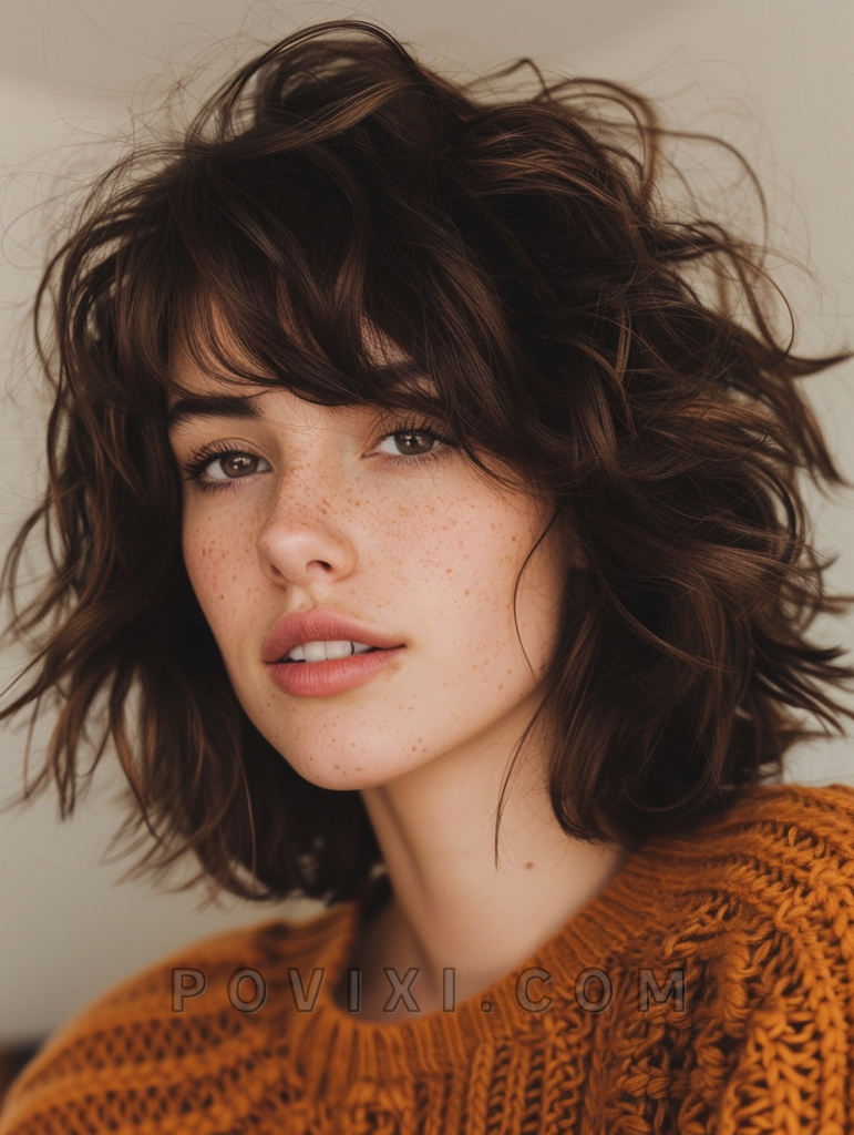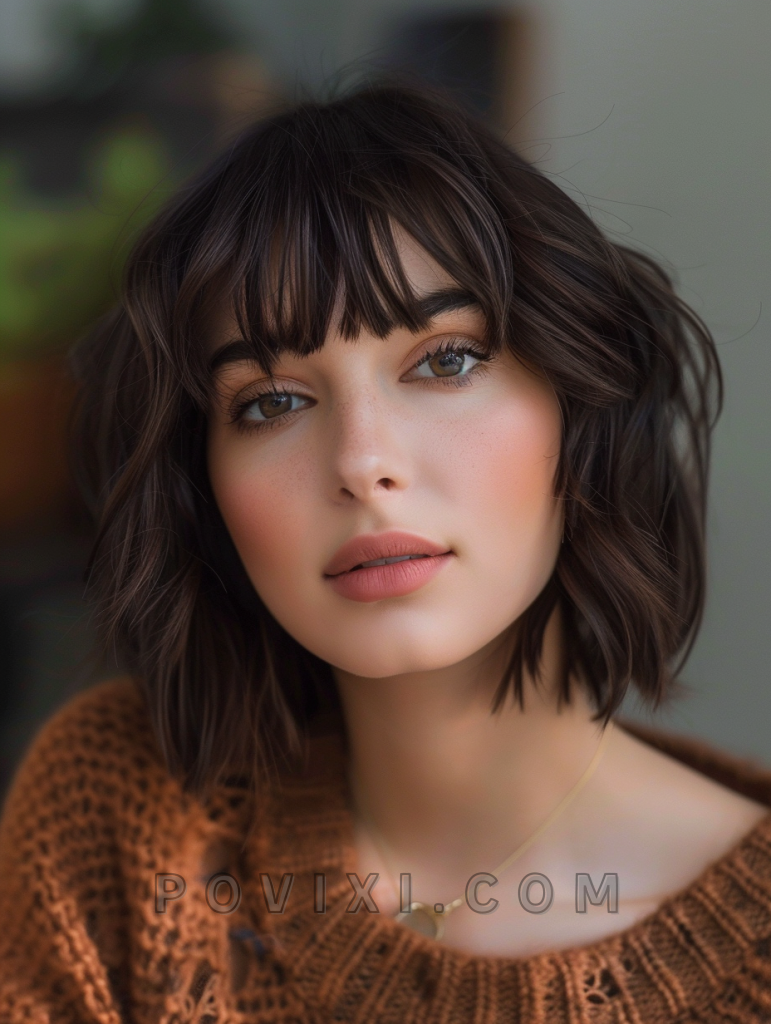 For a playful and edgy look, the choppy bob with bangs is an excellent choice. This cut features choppy layers and bangs that add texture and movement to the traditional bob. It’s perfect for casual and semi-formal events, offering a relaxed yet stylish appearance. The choppy bob with bangs suits oval and heart-shaped faces best, as it adds angles and enhances the natural structure of the face. Brown and hazel eyes are beautifully highlighted by this style.