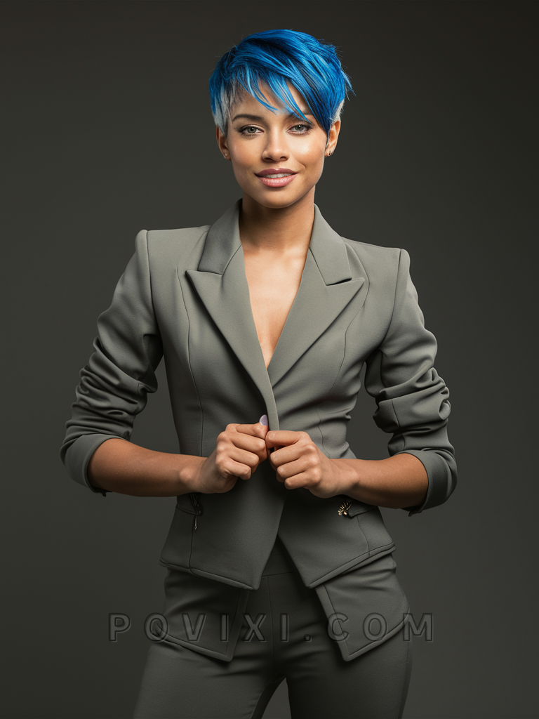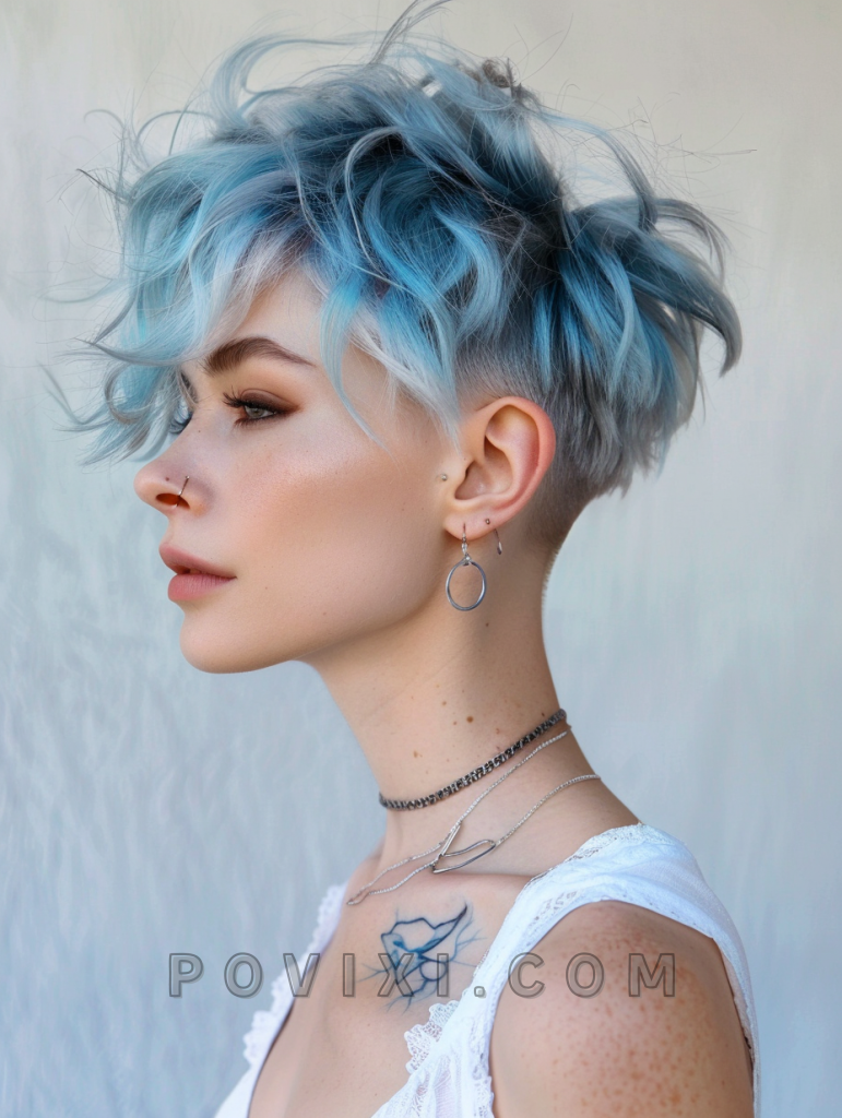 Add a cool edge to your pixie with an icy blue ombre. This style is especially suitable for those with cool undertones in their skin and looks stunning on angular face shapes. The icy blue provides a stark contrast with darker roots, making it a captivating look for winter.