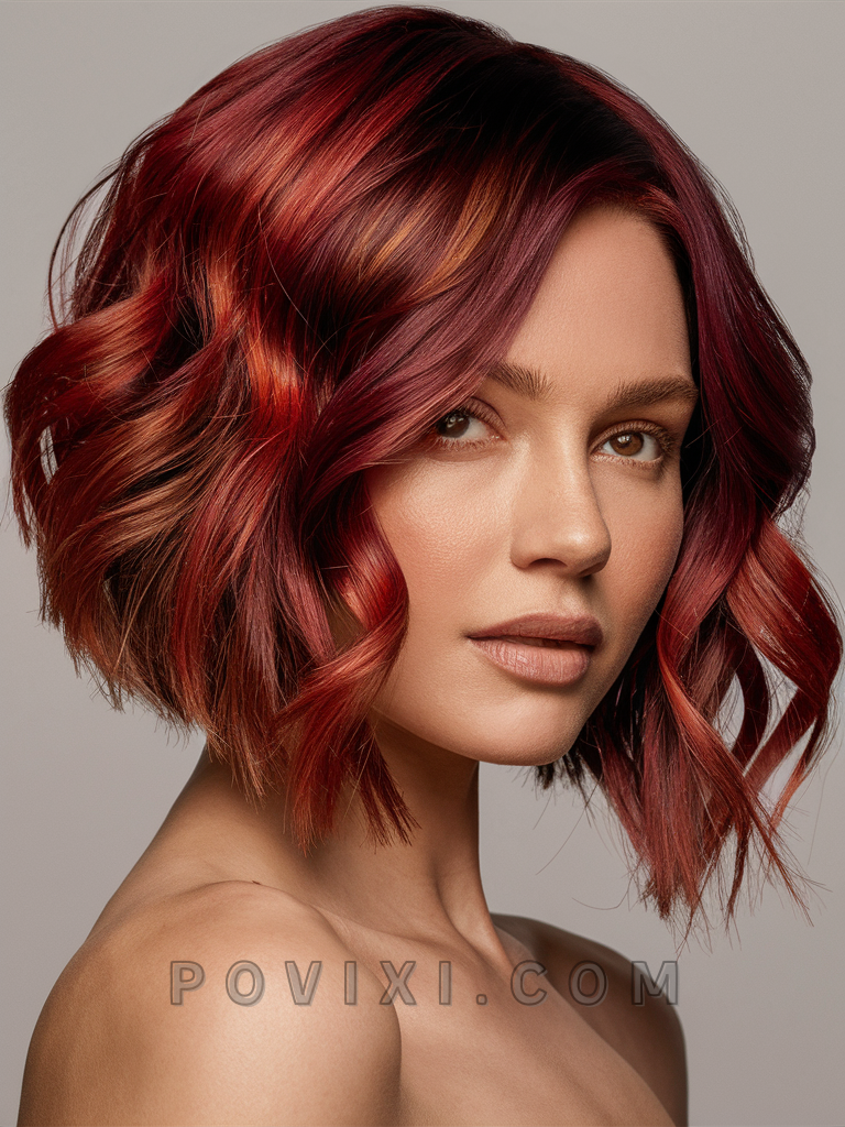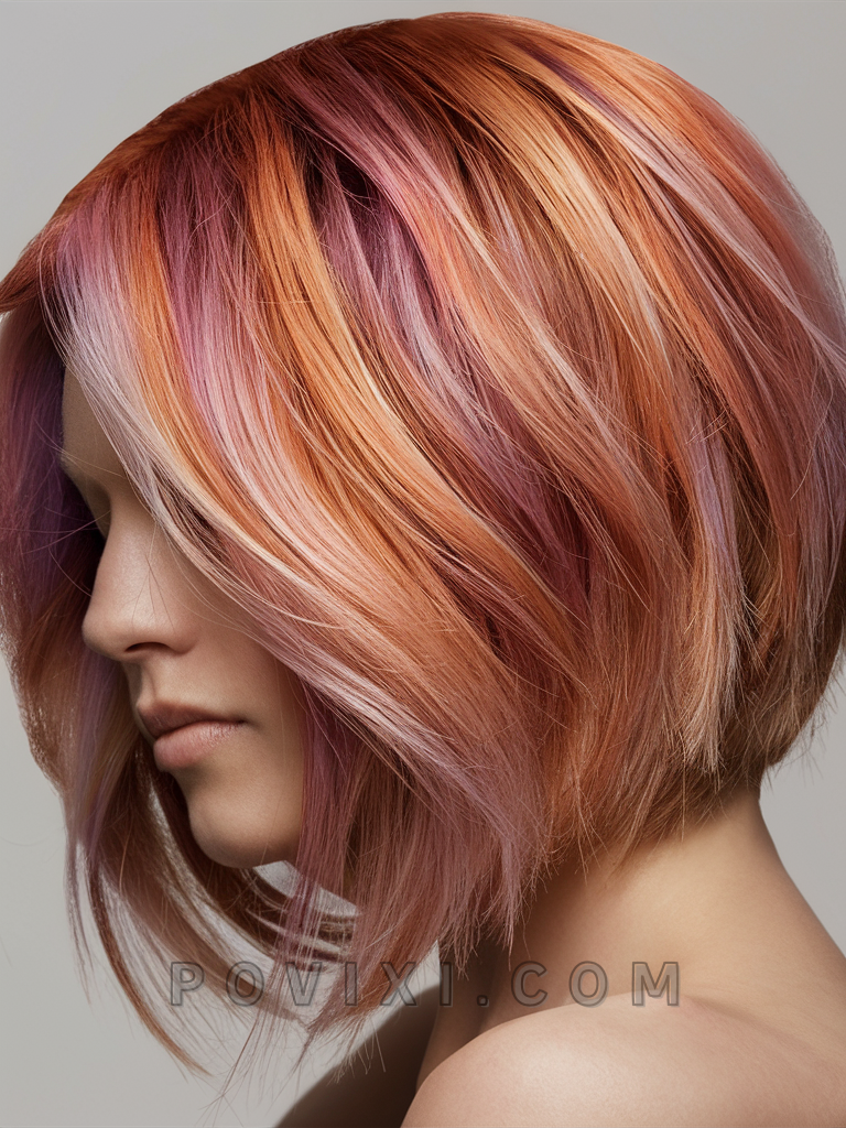 Capture the essence of a sunset with blends of red, orange, and purple shades on a layered bob. This style is a match for adventurous spirits and complements angular and round face shapes, making it quite universal.