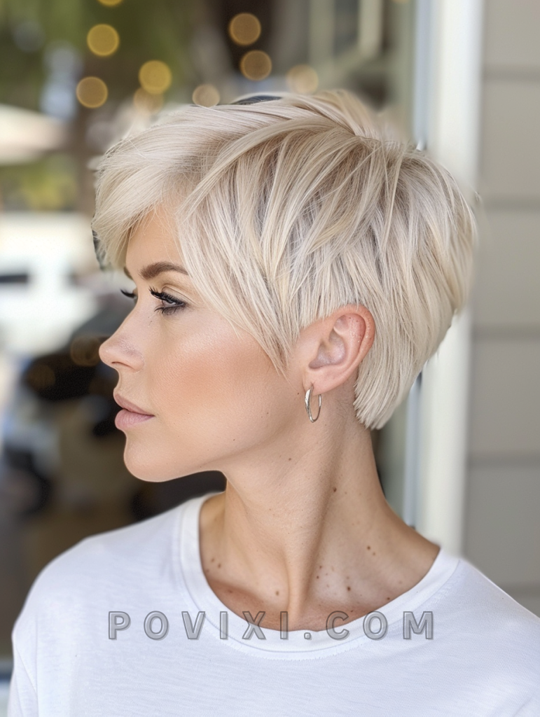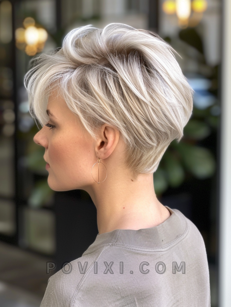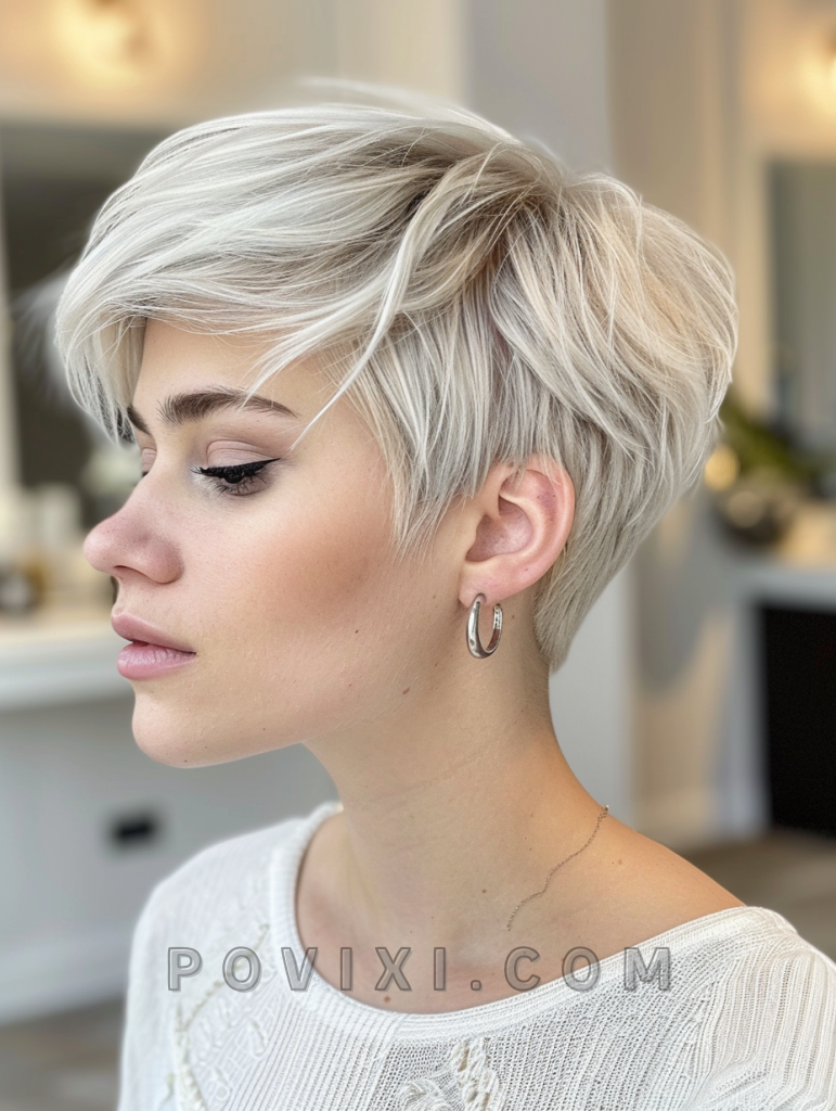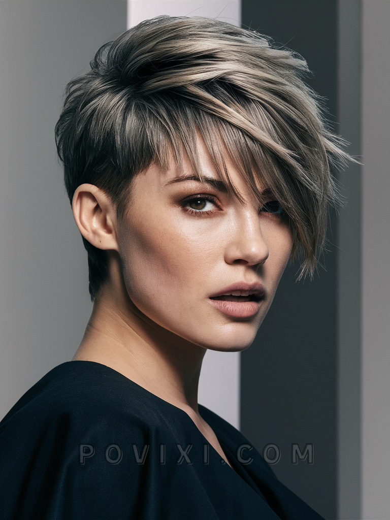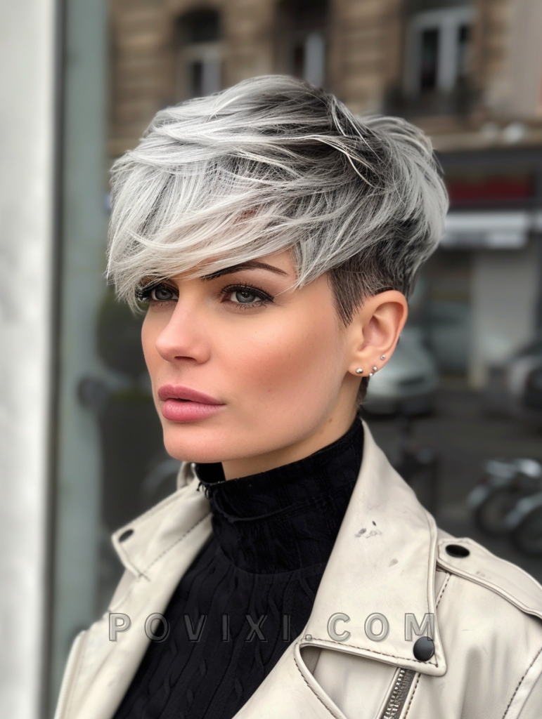 Add a touch of glam with platinum streaks on a classic pixie cut. This daring choice is best for cooler months and suits those with fair to medium skin tones.