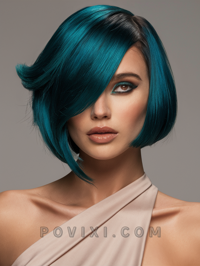 Make a bold statement this fall with peacock teal shades on an asymmetrical bob. This vibrant, deep blue-green shade suits cooler skin tones and brings an unexpected pop of color that’s sure to turn heads. It works well with edgy, fashion-forward outfits and occasions.