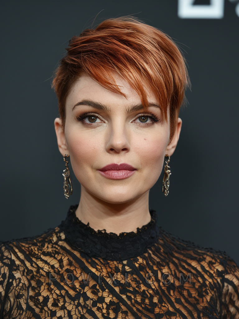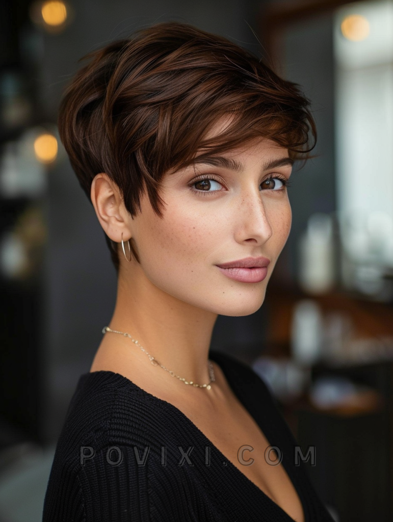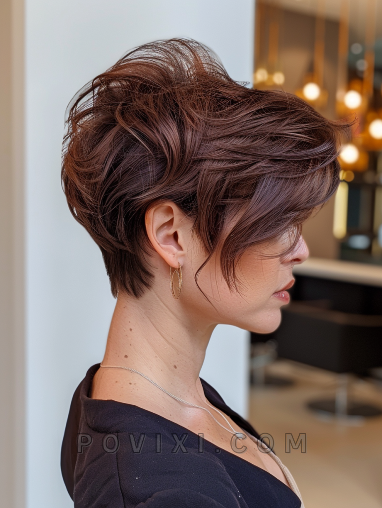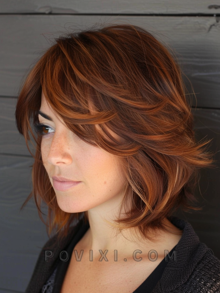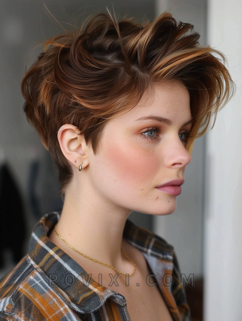 This fall, spice up your layered pixie with a cinnamon spice tint, an ideal choice for adding a warm, spicy note to your look. This color is flattering on olive and darker skin tones and complements brown or hazel eyes beautifully. It’s perfect for both day-to-day wear and special autumn gatherings.