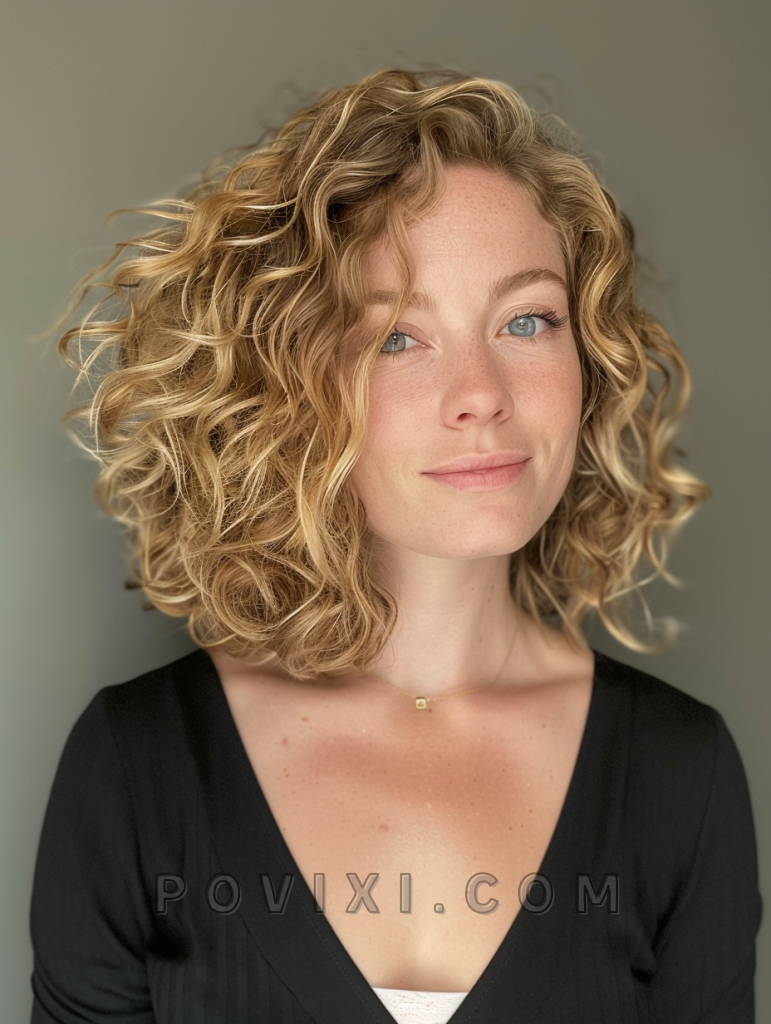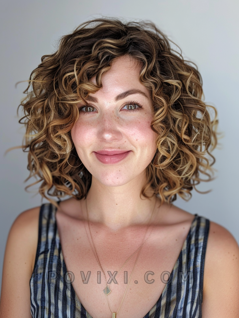 Curly bobs can be beautifully enhanced with honey blonde highlights, which add depth and dimension to your natural curls. This style is perfect for adding a touch of lightness around the face and works well with all skin tones and eye colors.