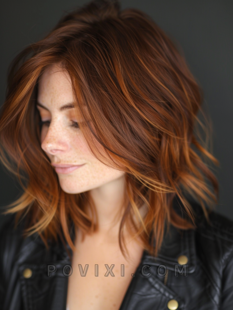 A chestnut brown base with ginger highlights is a warm and inviting option for fall. It’s suitable for all face shapes and brings a glowing warmth to those with green or brown eyes.