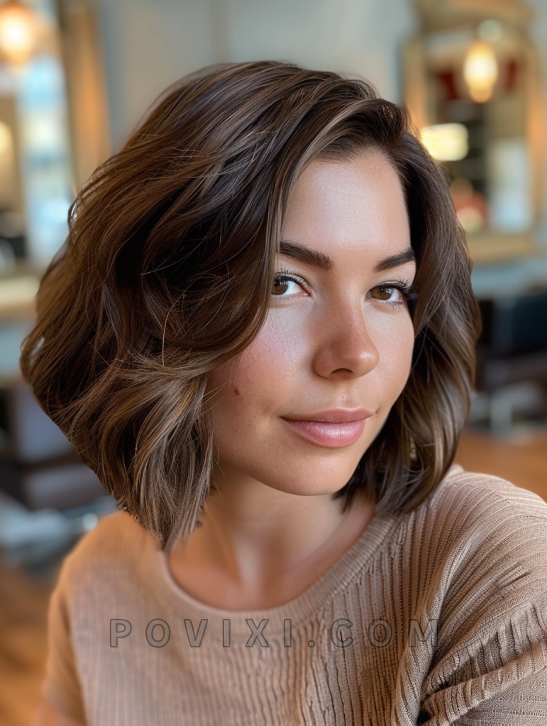 Short brown bob haircuts can be enhanced with swirls of caramel highlights, introducing dimension and depth. This style suits all face shapes and brings out the best in dark eye colors. It’s perfect for a casual coffee date or a professional meeting.