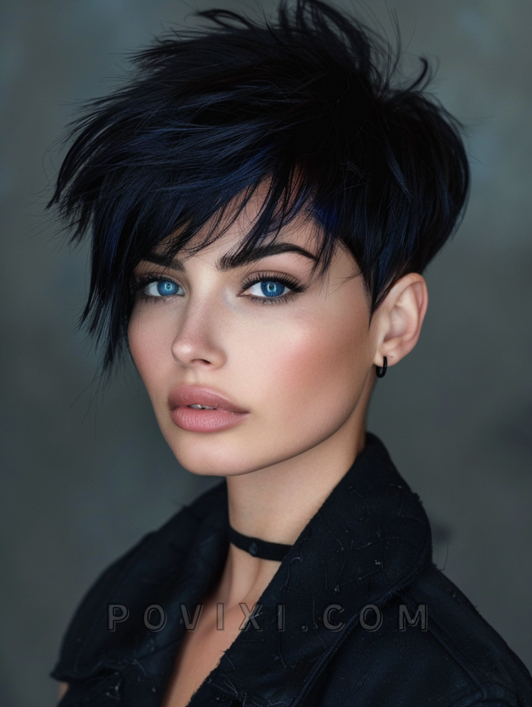 Make a bold statement with jet black hair featuring subtle sapphire undertones. This color choice is striking on very short hair like buzz cuts or very short bobs and is particularly daring for anyone looking to stand out. This dramatic hue suits all face shapes and brings out the intensity in any eye color.