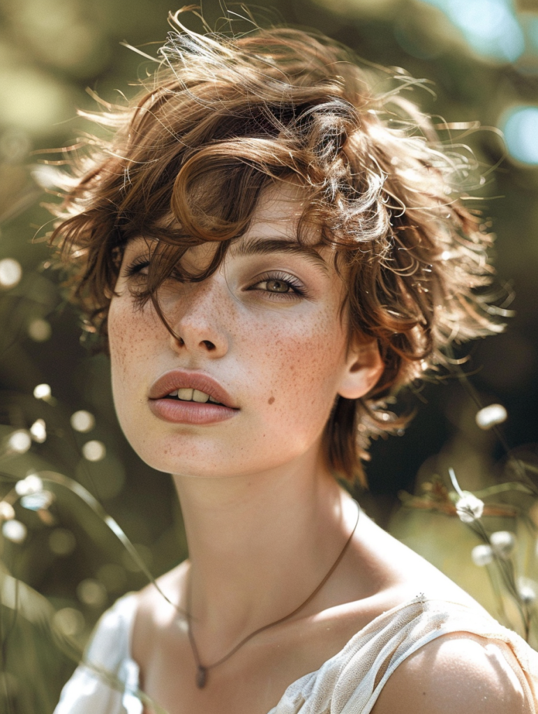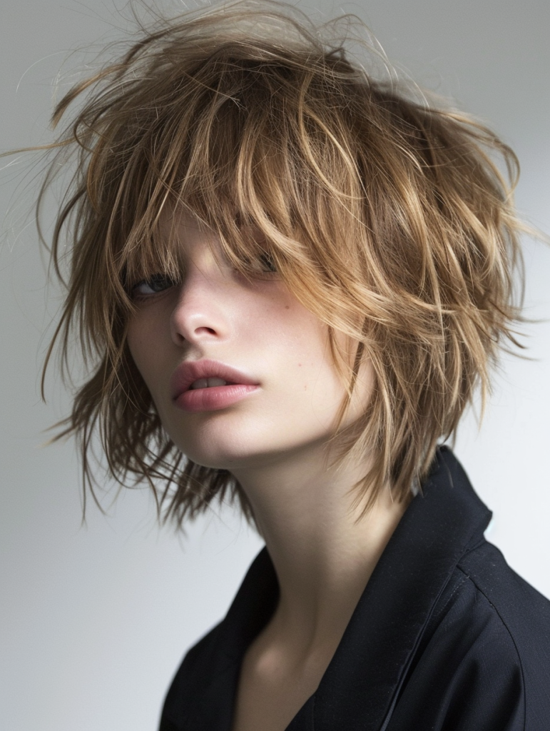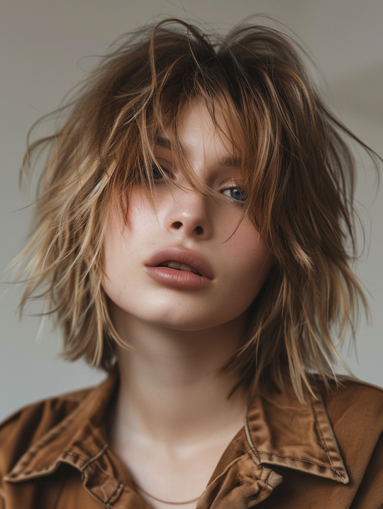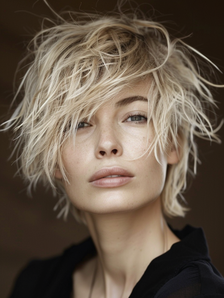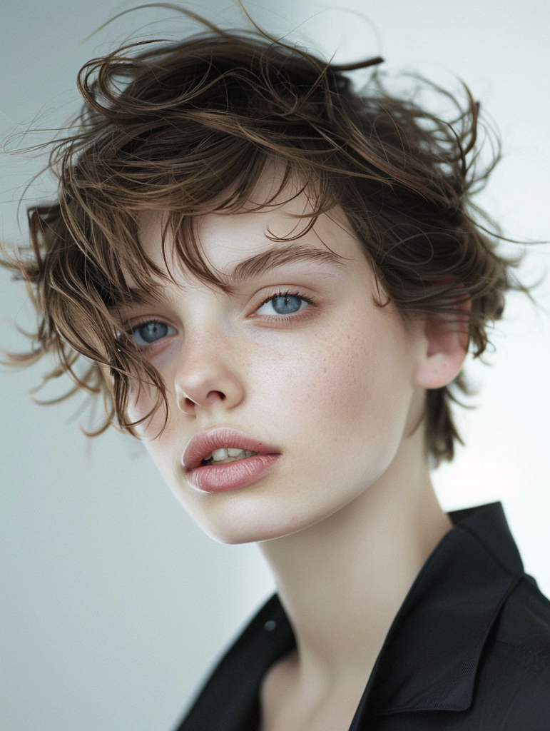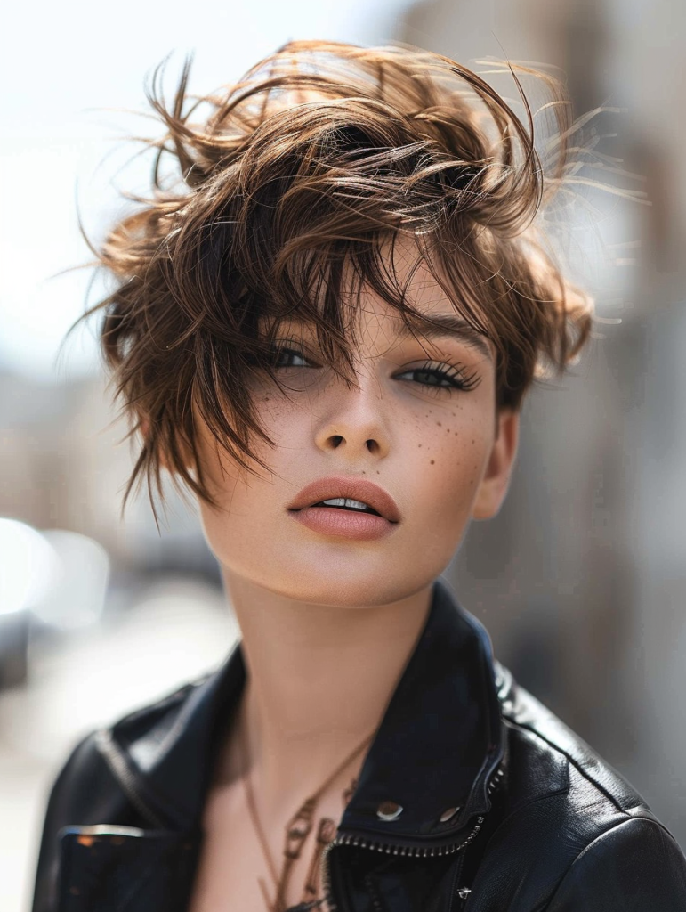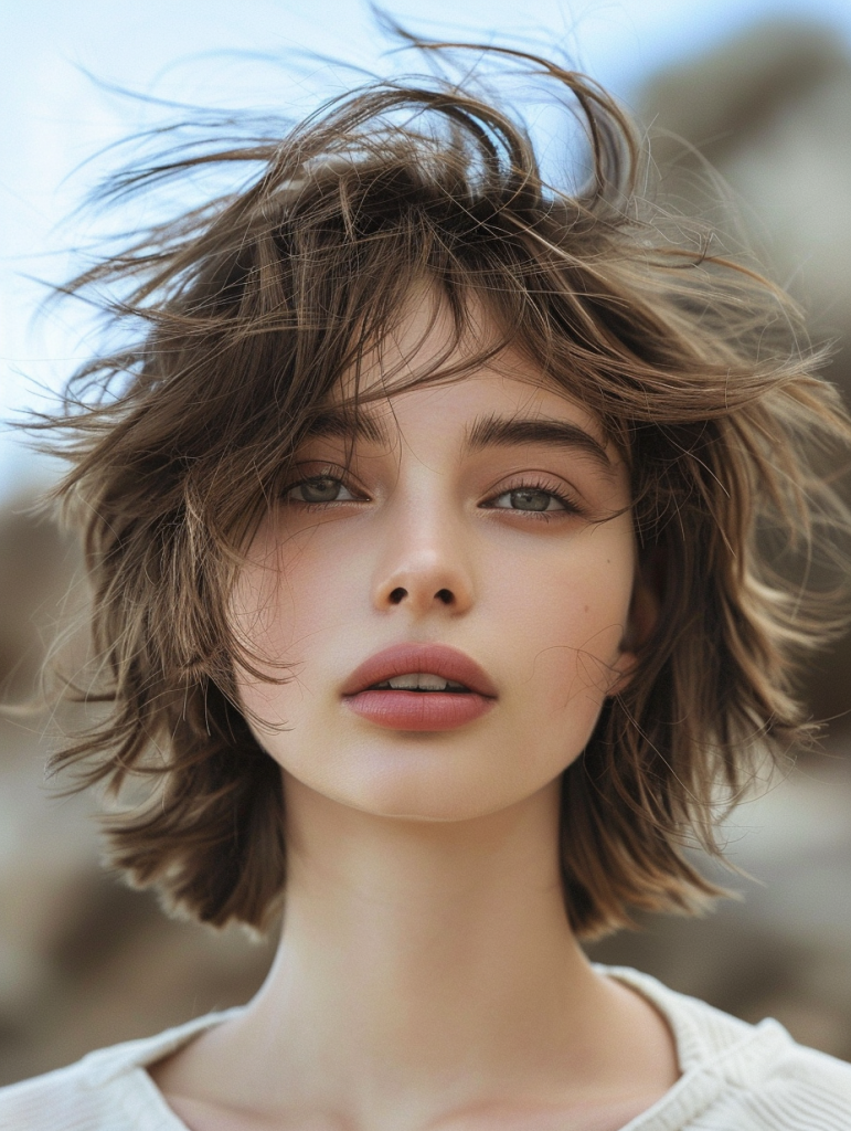 The Versatile Shaggy Pixie is perfect for those with a round face. Its layered texture helps elongate the face, providing a flattering silhouette. This style is perfect for casual outings and professional environments alike. It pairs beautifully with subtle eye makeup, enhancing natural facial features.