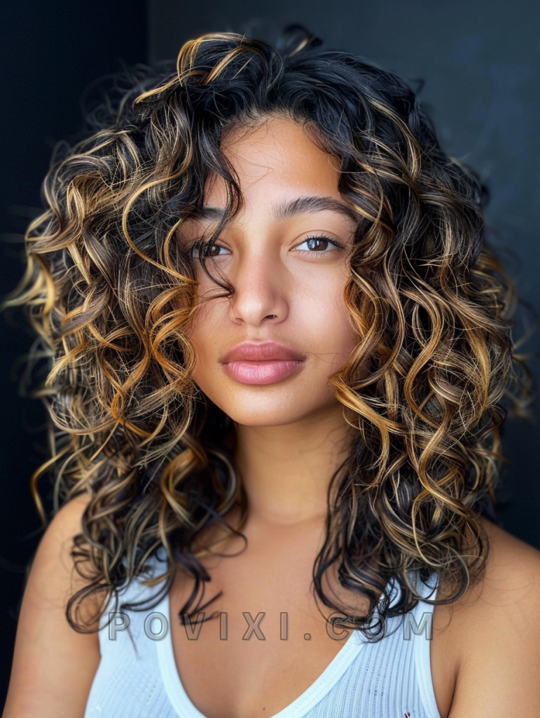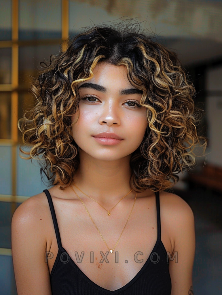 Transform your medium shoulder length curls with golden streaks that add brightness and movement. This hairstyle is excellent for those with naturally curly hair, providing a playful yet sophisticated look. It’s particularly flattering for round and square face shapes, as the curls soften angles and the blonde streaks draw the eye vertically, elongating the face.