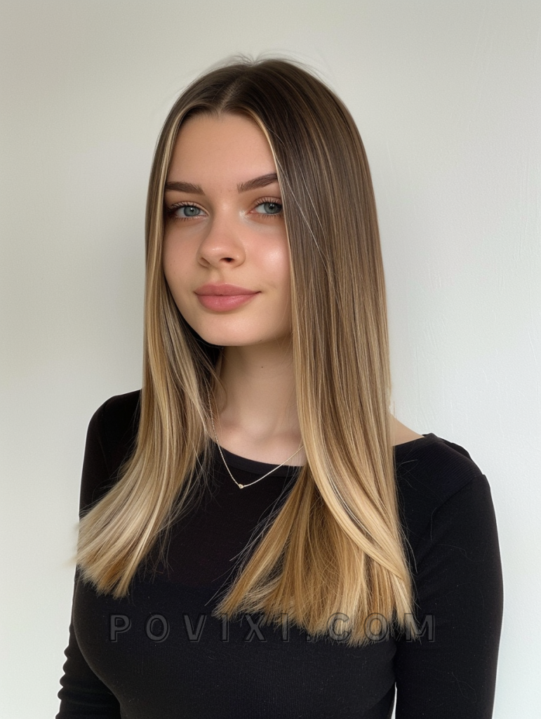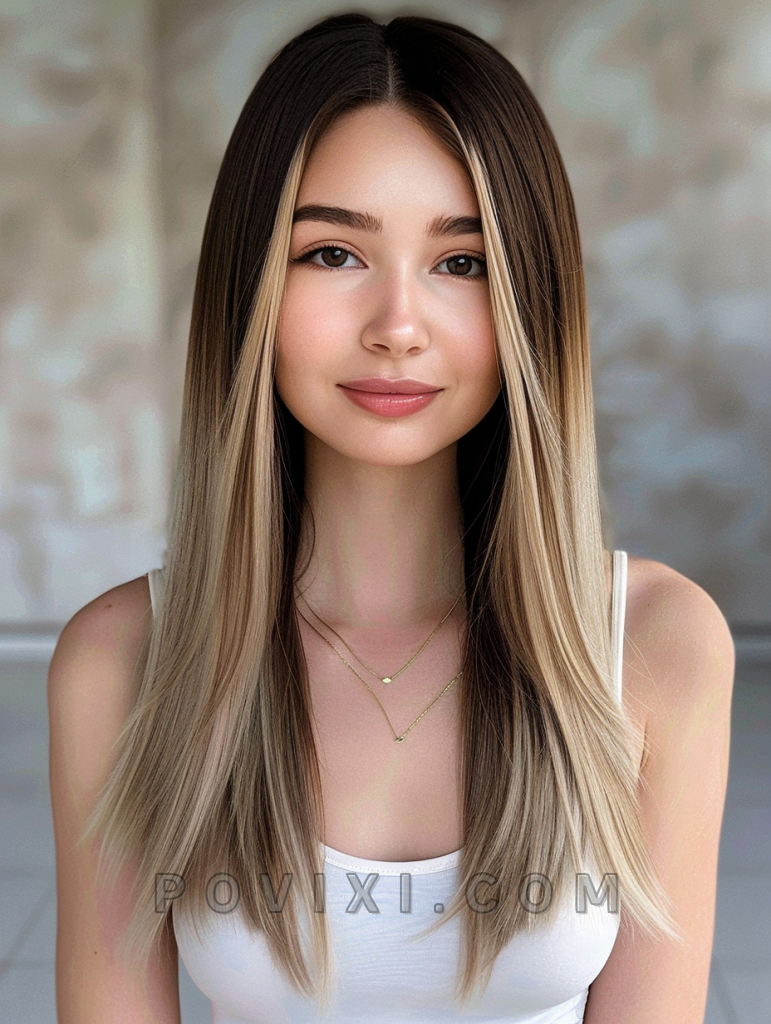 Achieving this look might require a keratin treatment to maintain the sleekness, while the tips are lightened to a cool-toned blonde. Use a heat protectant and a lightweight oil to enhance shine and prevent damage.