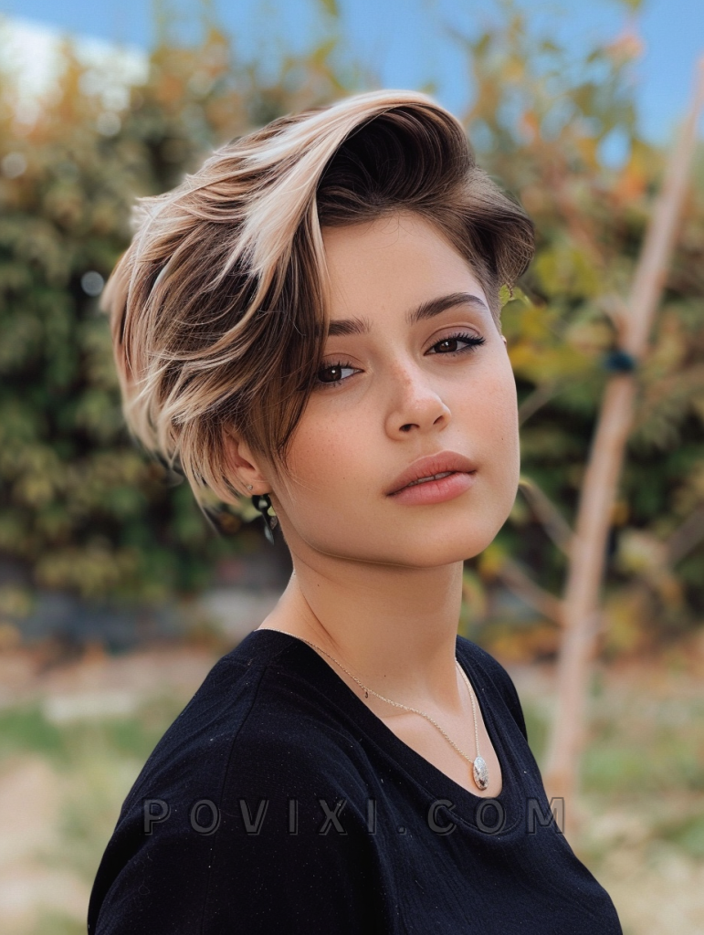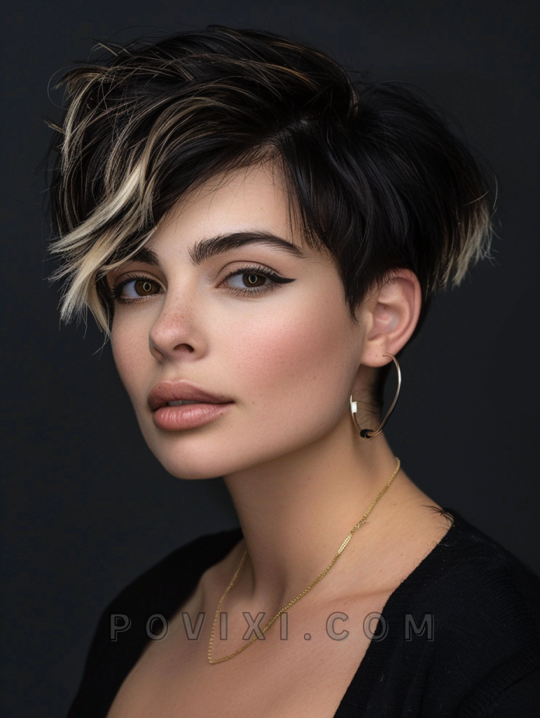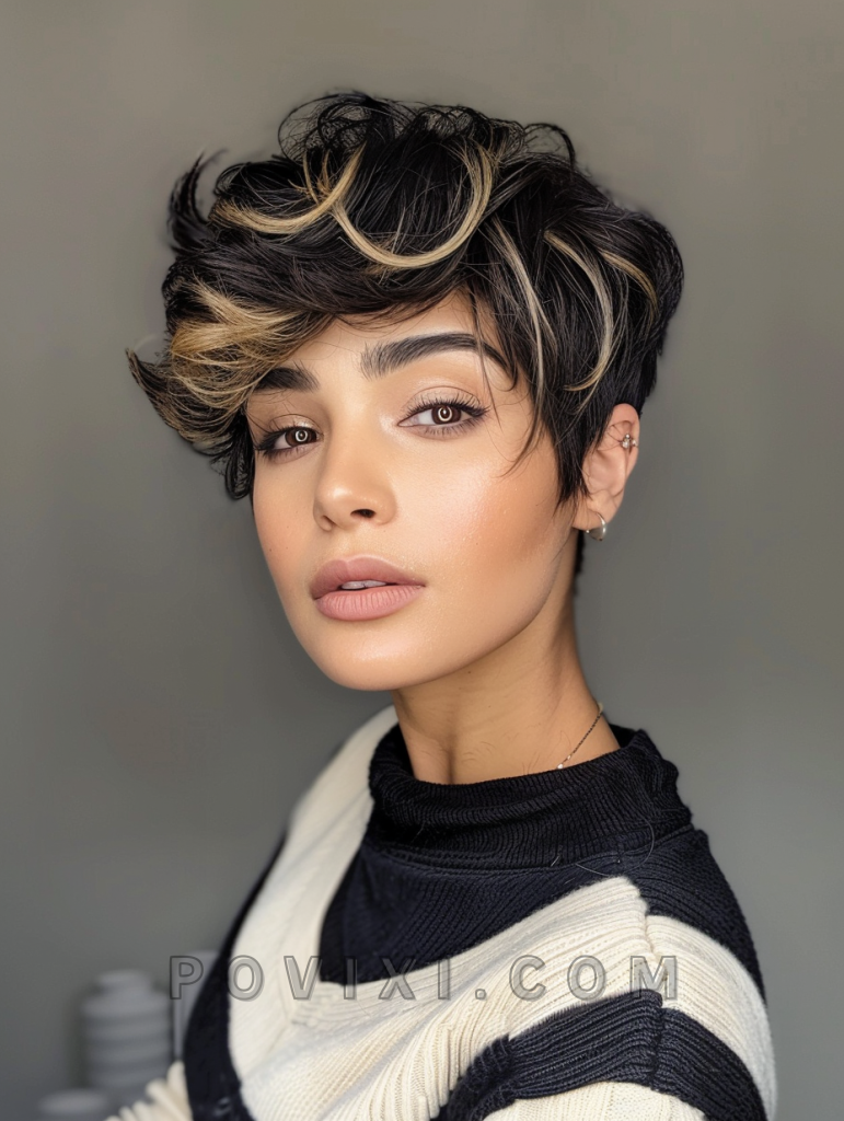 Add a modern twist to a classic pixie cut with chunky highlights. This style suits an edgy, modern wardrobe and works well with angular face shapes like diamond or square. It’s a great way to highlight sharp features and add texture to the hair.