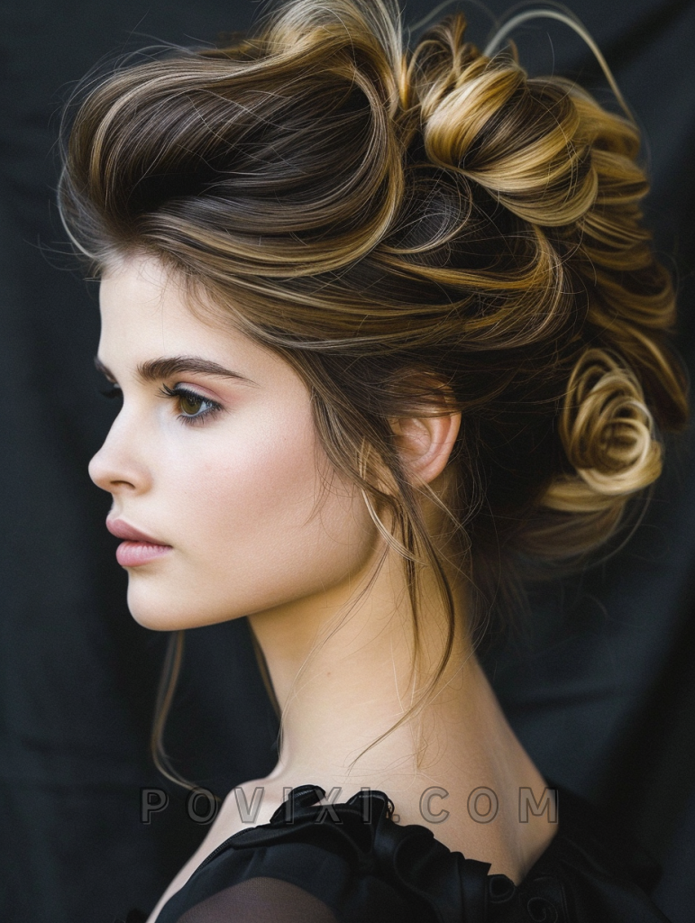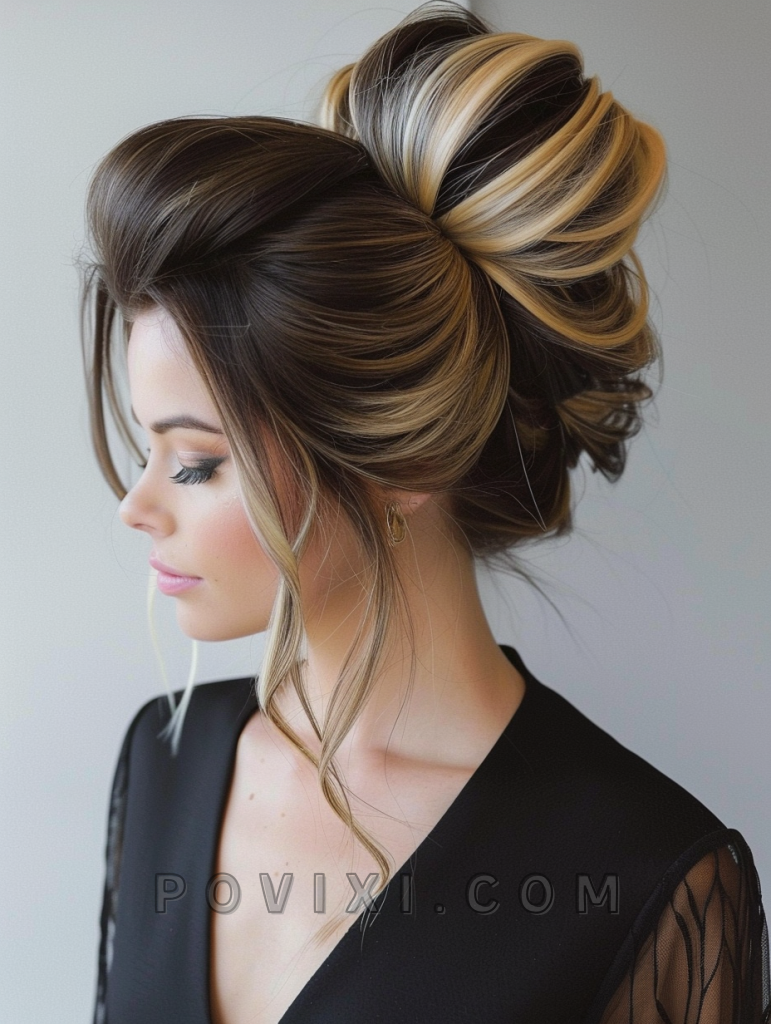 Styling involves creating soft curls or waves before pinning the hair up, with light blonde streaks woven throughout to catch the light. A strong hold hairspray and occasional gloss treatments will keep this look in perfect condition.
