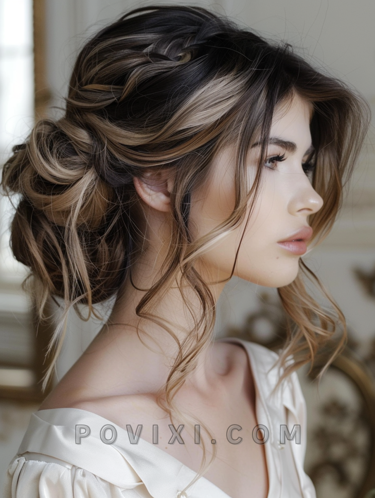 For a more romantic and elegant look, consider an updo with soft blonde accents. This hairstyle is perfect for weddings or other formal events and suits those with medium length to long hair. It complements round and heart-shaped faces by drawing attention upwards and highlighting the neckline.