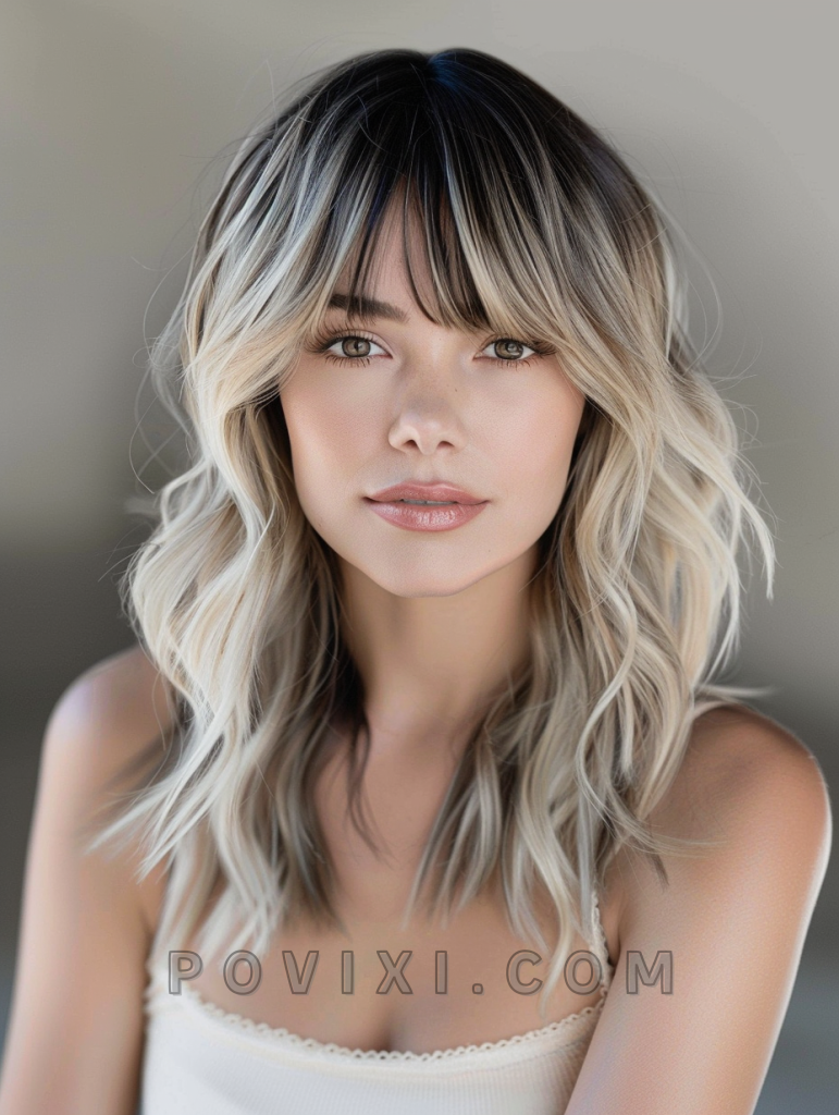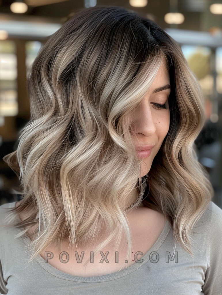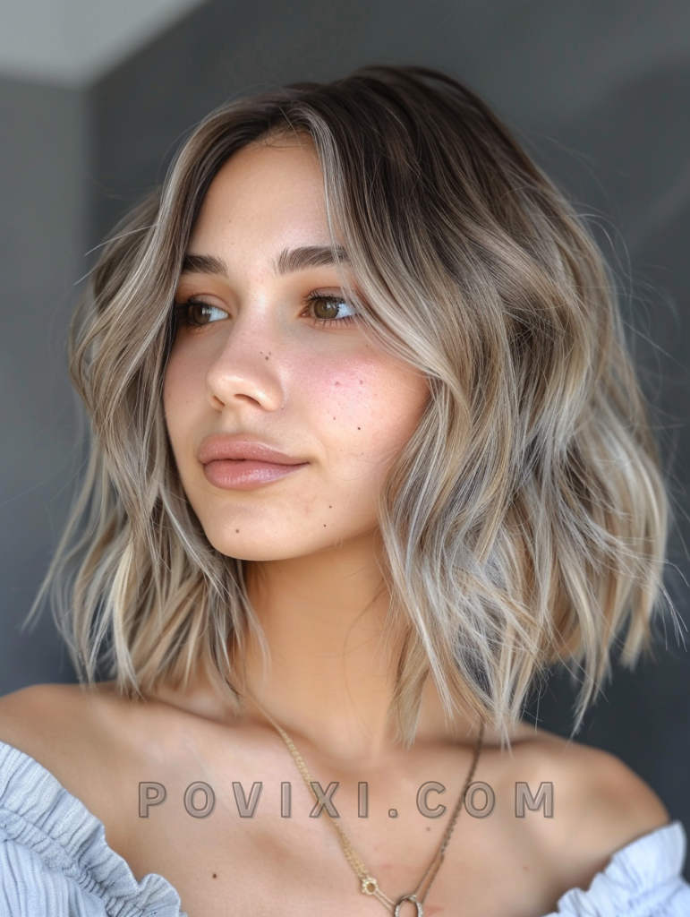 A tousled lob (long bob) with ash blonde balayage is perfect for a relaxed yet stylish look. This hairstyle fits well with medium shoulder length hair and is universally flattering across all face shapes.
