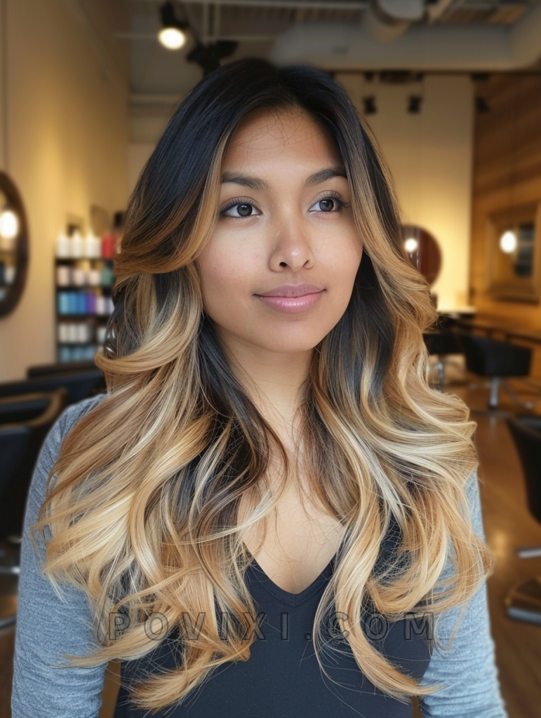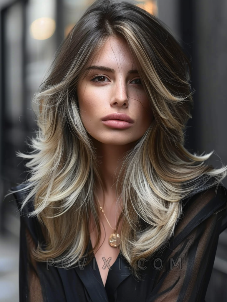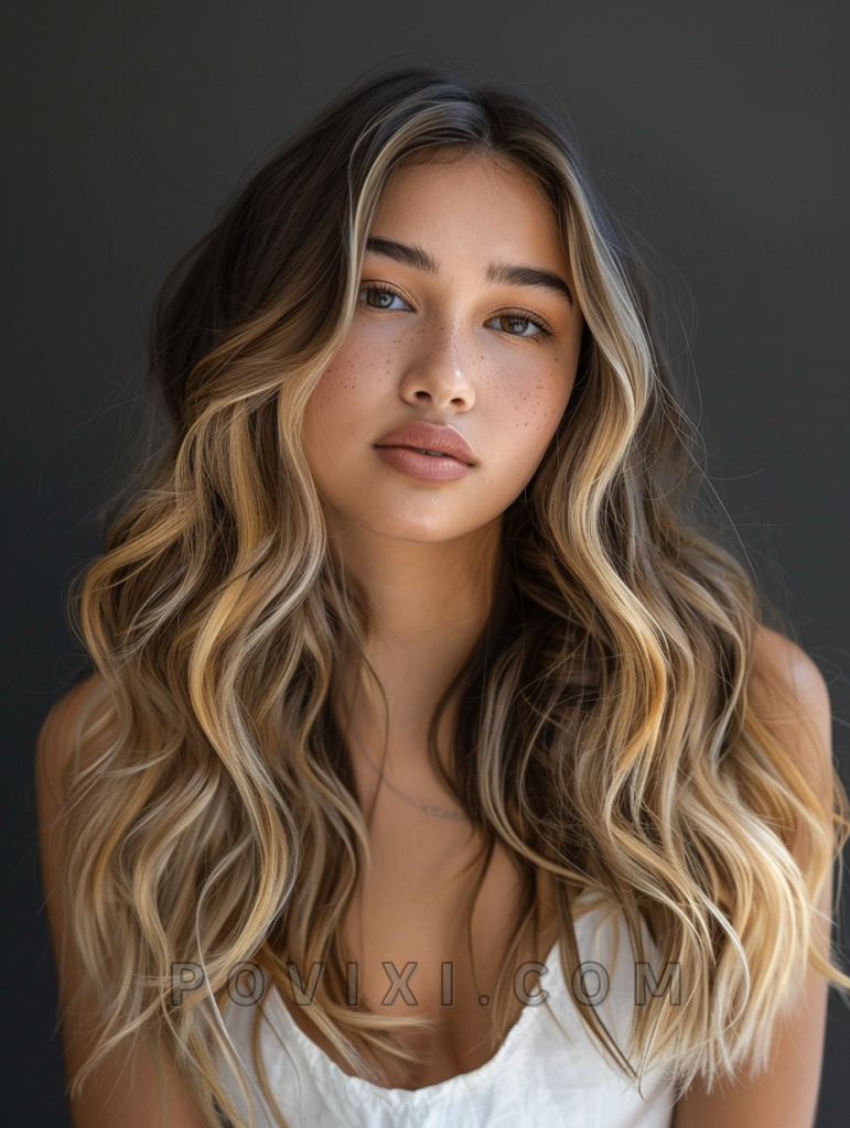 For those with long hair, a cascading balayage offers a stunning, beach-ready look. This style works well for all face shapes and is particularly appealing with hazel or green eyes, as the blonde highlights can reflect these colors beautifully. It’s perfect for both casual gatherings and more formal occasions.