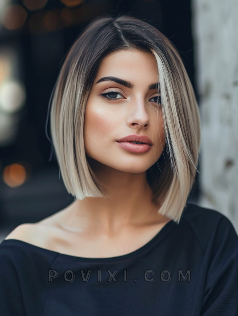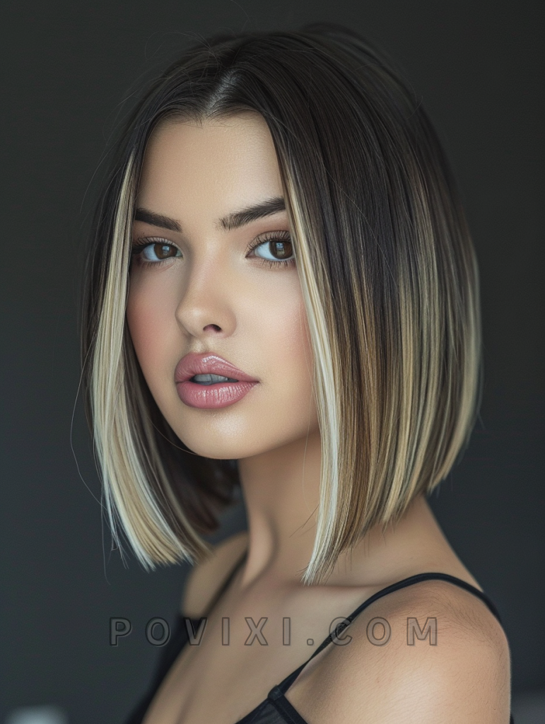 An angled bob cut sharp and sleek with ice blonde streaks offers a modern, edgy look. It’s especially striking on short hair and suits angular, defined face shapes. This style is a standout for professional environments or bold social statements.