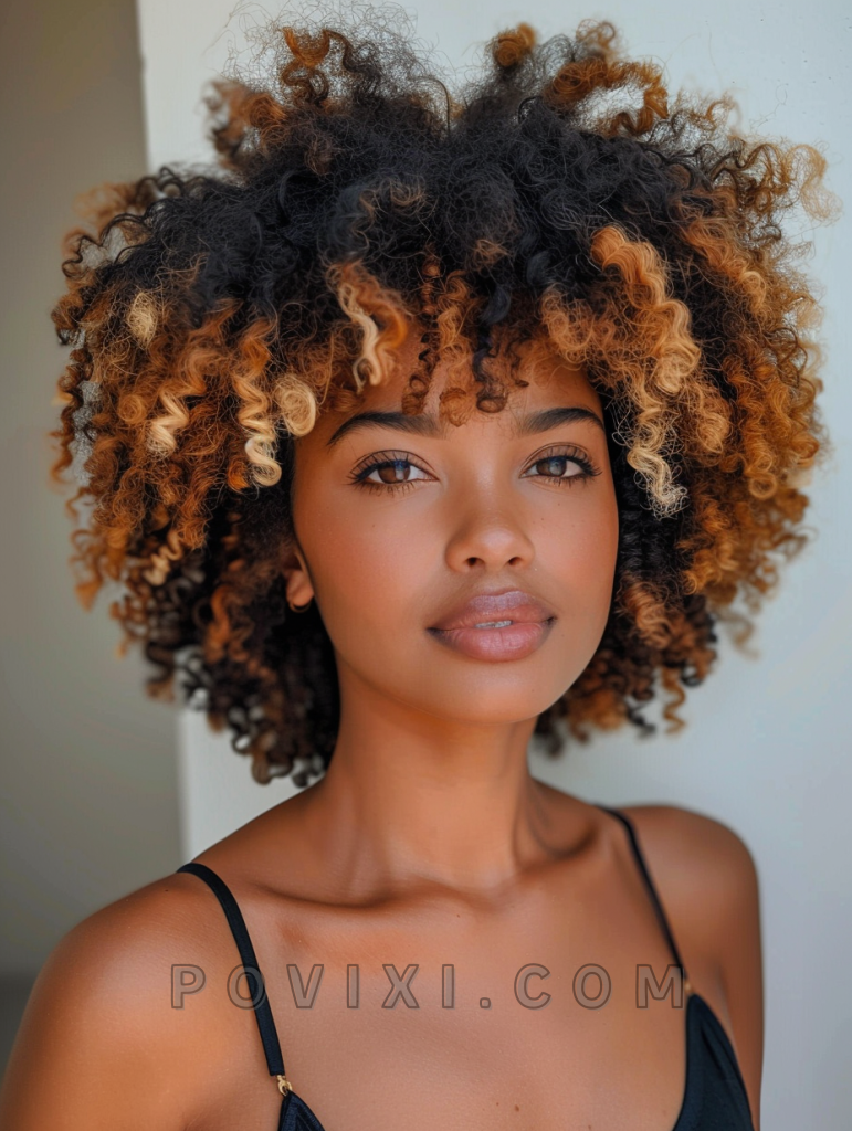 For those with natural afro-textured hair, adding caramel highlights can enhance the hair’s voluminous shape and texture. This style is perfect for embracing natural curls and suits any face shape, enhancing the golden undertones of darker skin.