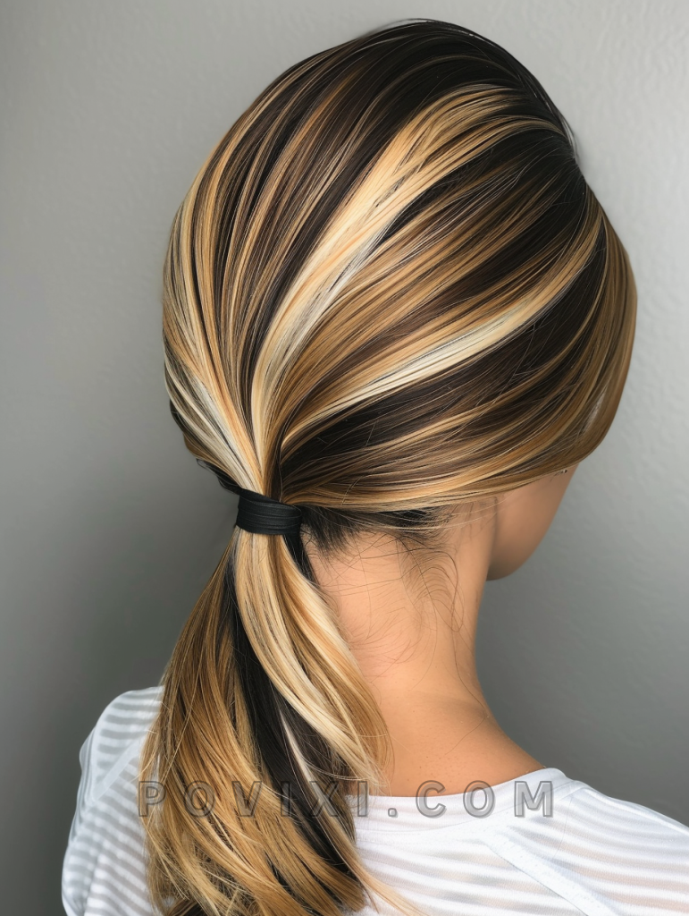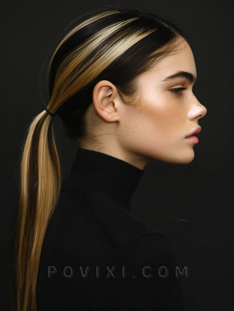 A sleek ponytail with high-contrast blonde highlights is both practical and chic, ideal for those who need a style that transitions easily from day to night. This look is versatile, suiting all face shapes, especially when paired with sharp, tailored outfits.