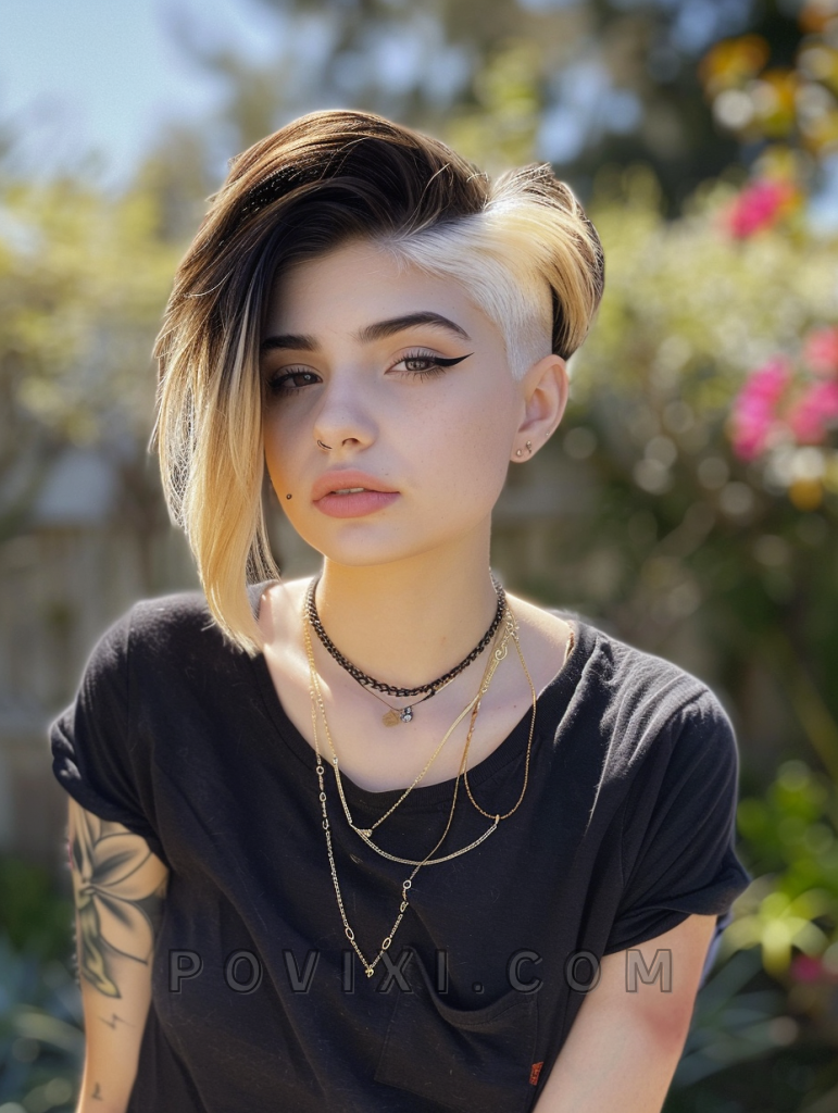 A buzz cut with a bold blonde patch offers a daring and low-maintenance option. It’s particularly striking for men or women who enjoy standing out. This style suits all face shapes and is excellent for showcasing facial features.