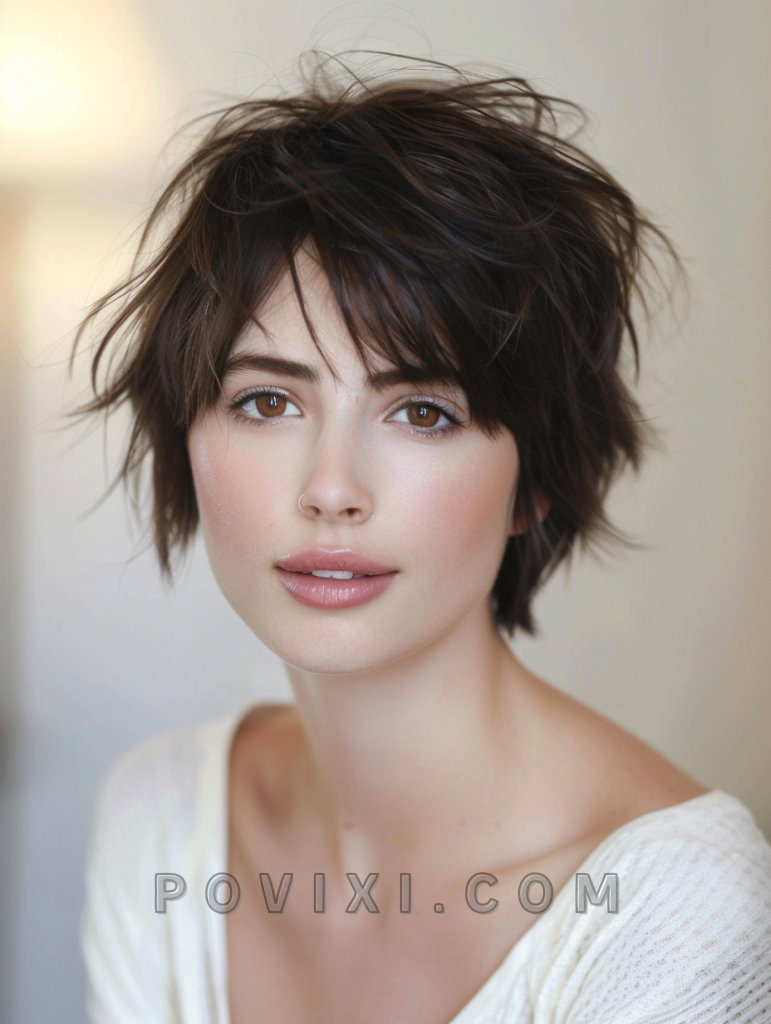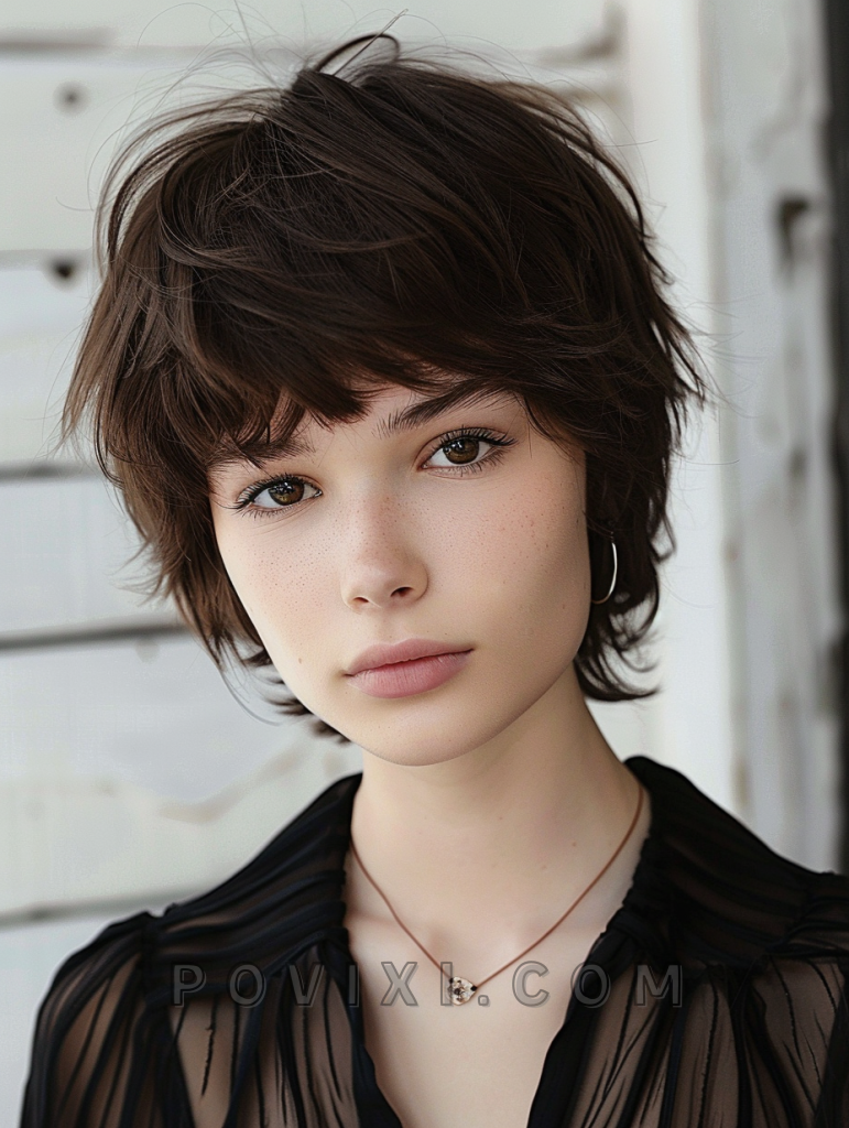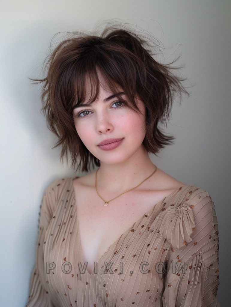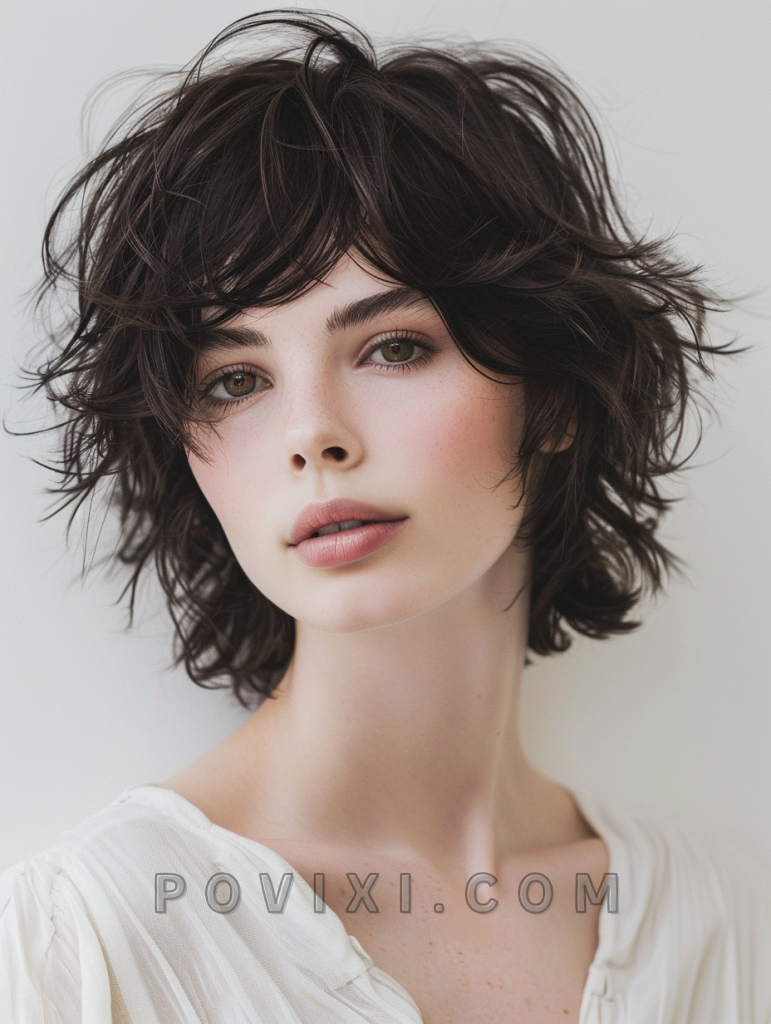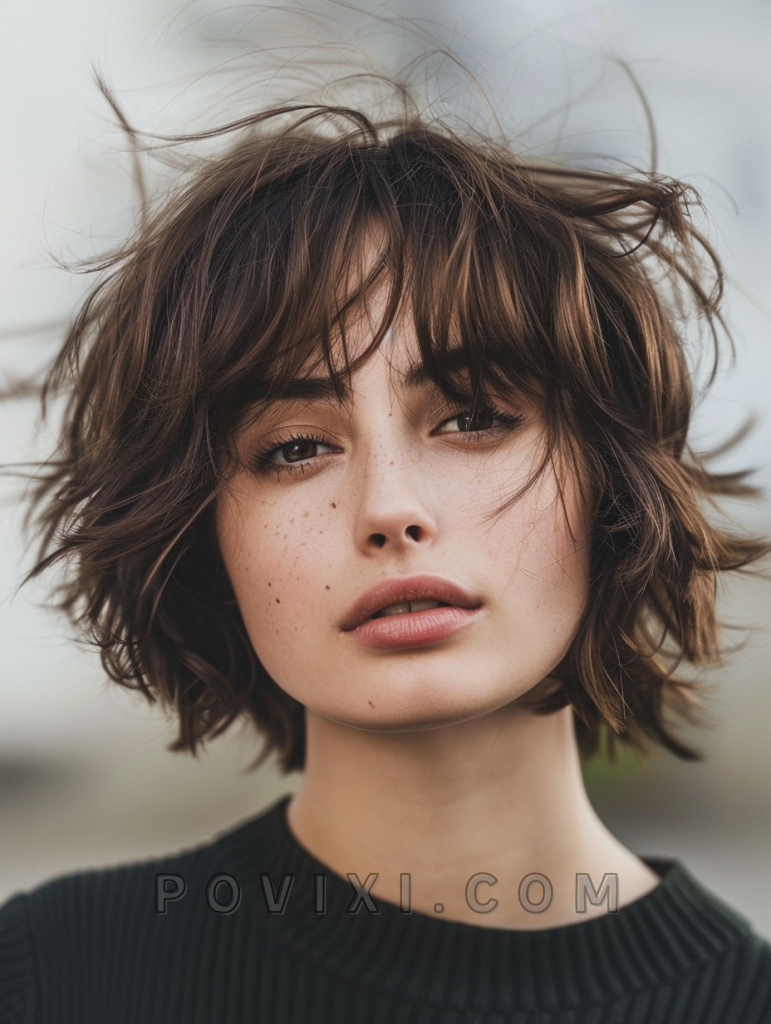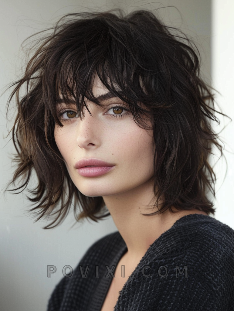 This modern shag haircut is ideal for women with fine hair. It embodies a chic, carefree spirit suitable for both casual outings and formal events. The messy bob works wonderfully on oval and heart-shaped faces, enhancing features with its layered texture. Suitable eye colors for this style would lean towards the vibrant—think striking blues or deep greens to complement the playful nature of the bob.