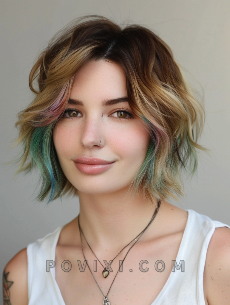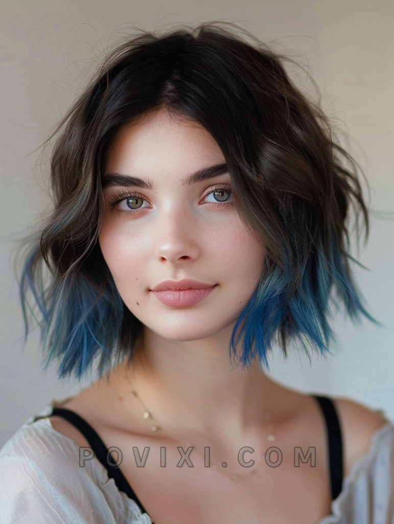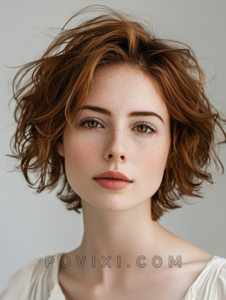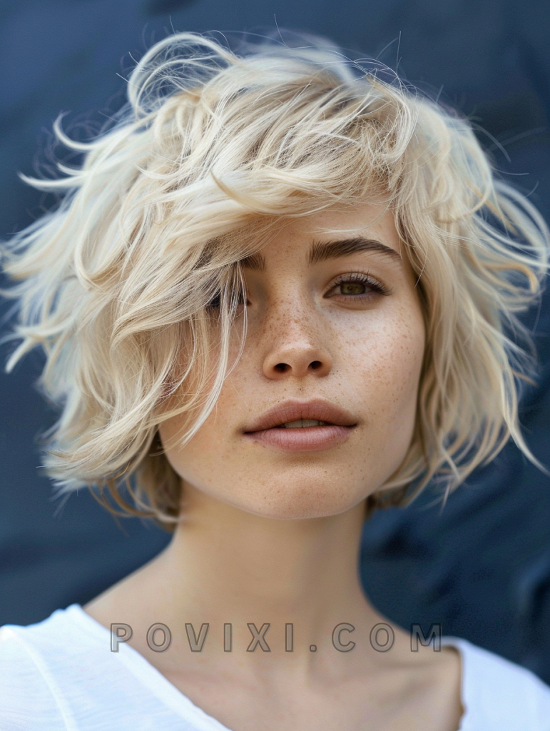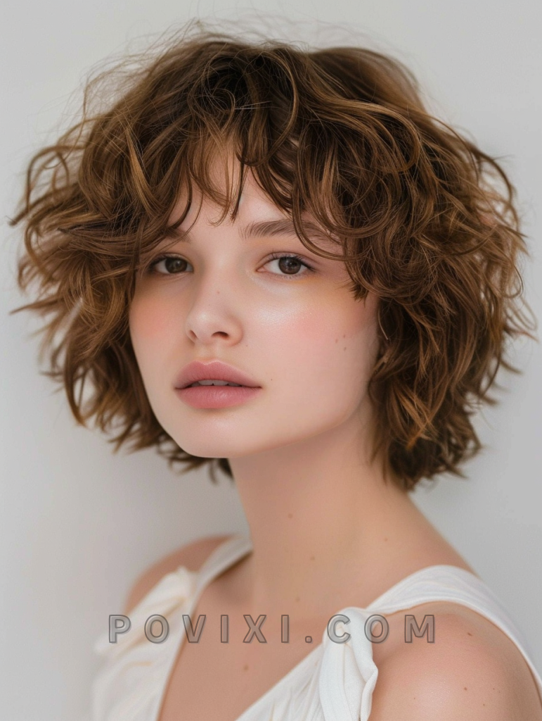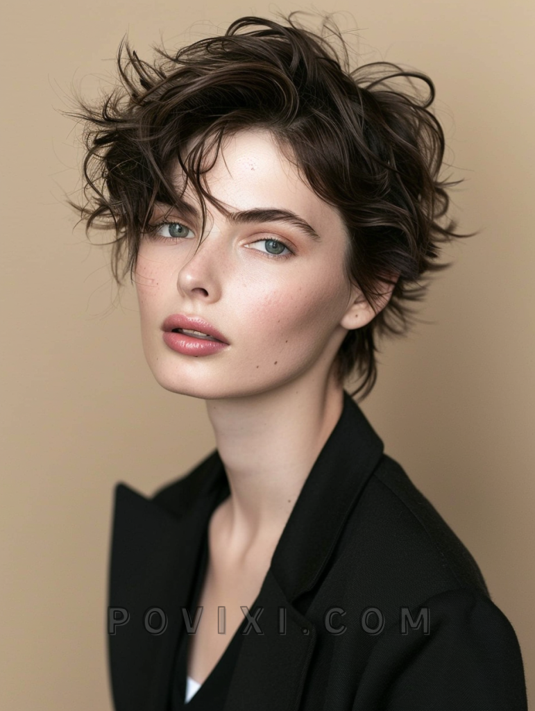 This modern shag haircut is ideal for women with fine hair. It embodies a chic, carefree spirit suitable for both casual outings and formal events. The messy bob works wonderfully on oval and heart-shaped faces, enhancing features with its layered texture. Suitable eye colors for this style would lean towards the vibrant—think striking blues or deep greens to complement the playful nature of the bob.