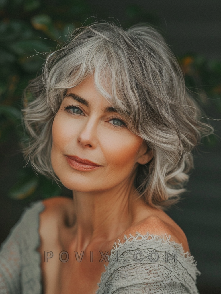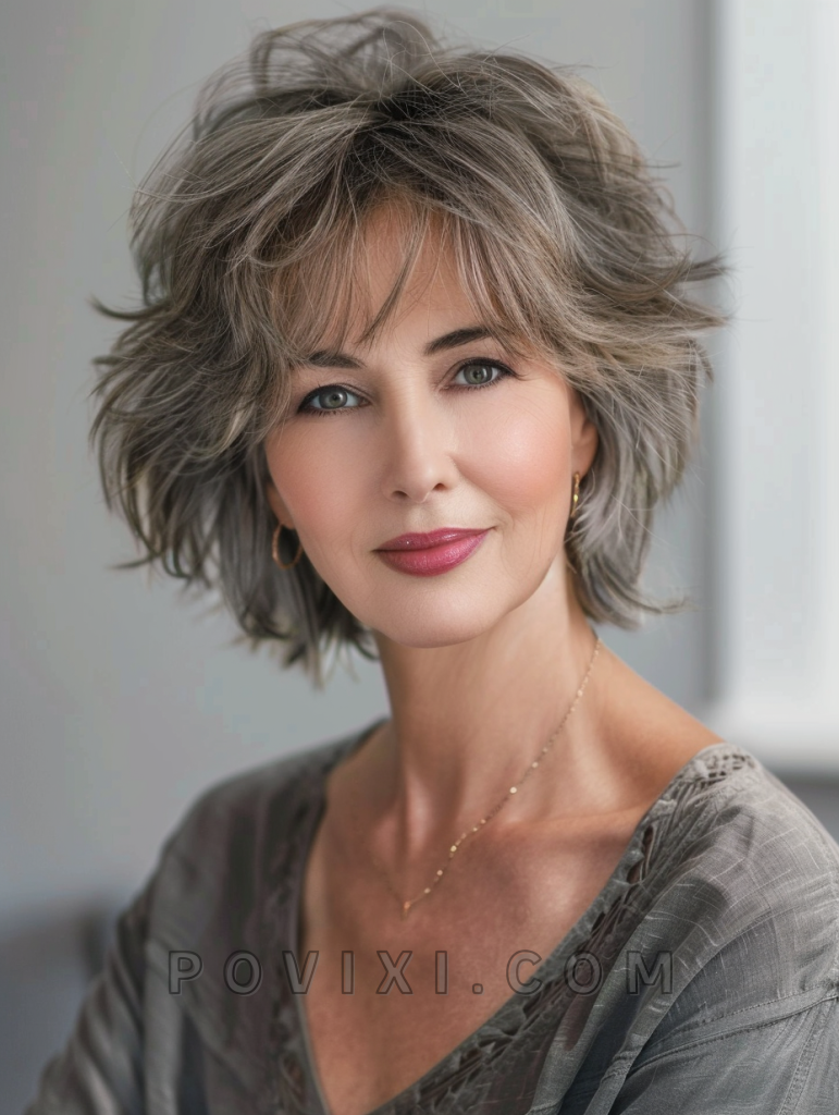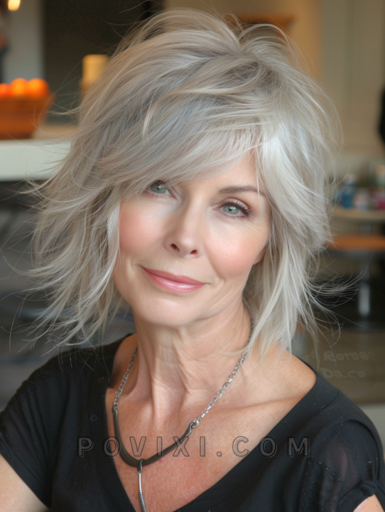 Embrace the elegance of gray or silver hair with a sophisticated silver shag. This style adds a modern twist to gray hair, showing that aging can be stylish. It’s ideal for women over 50 or women over 60 looking for a fashionable, mature hairstyle.
