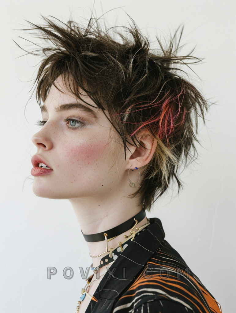 Styling this cut might involve texturizing powders or sprays to enhance the choppy layers and give a grittier, more defined look to the style.