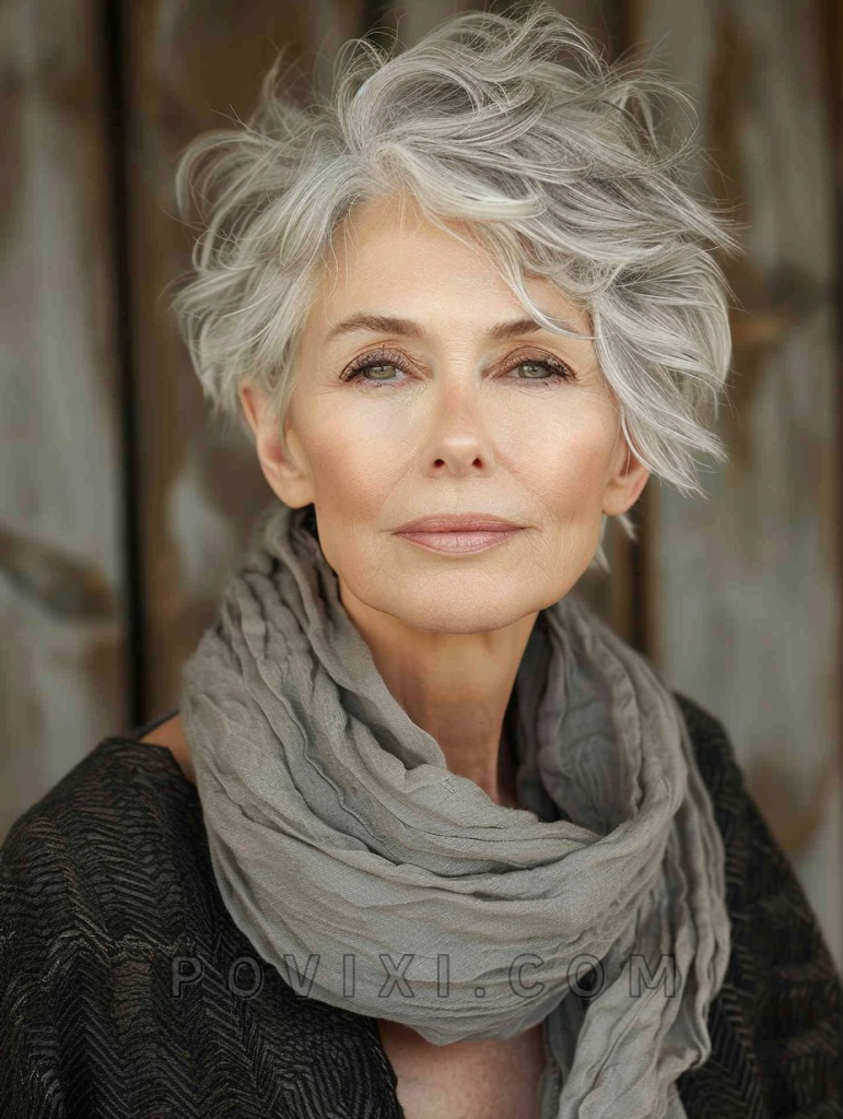 Combine the ease of a pixie cut with the playful texture of a shag in this tousled pixie shag. This hairstyle is particularly suited for women with thin hair as it creates the illusion of thickness and fullness. It’s an excellent option for women over 60 who want a chic, low-maintenance style.