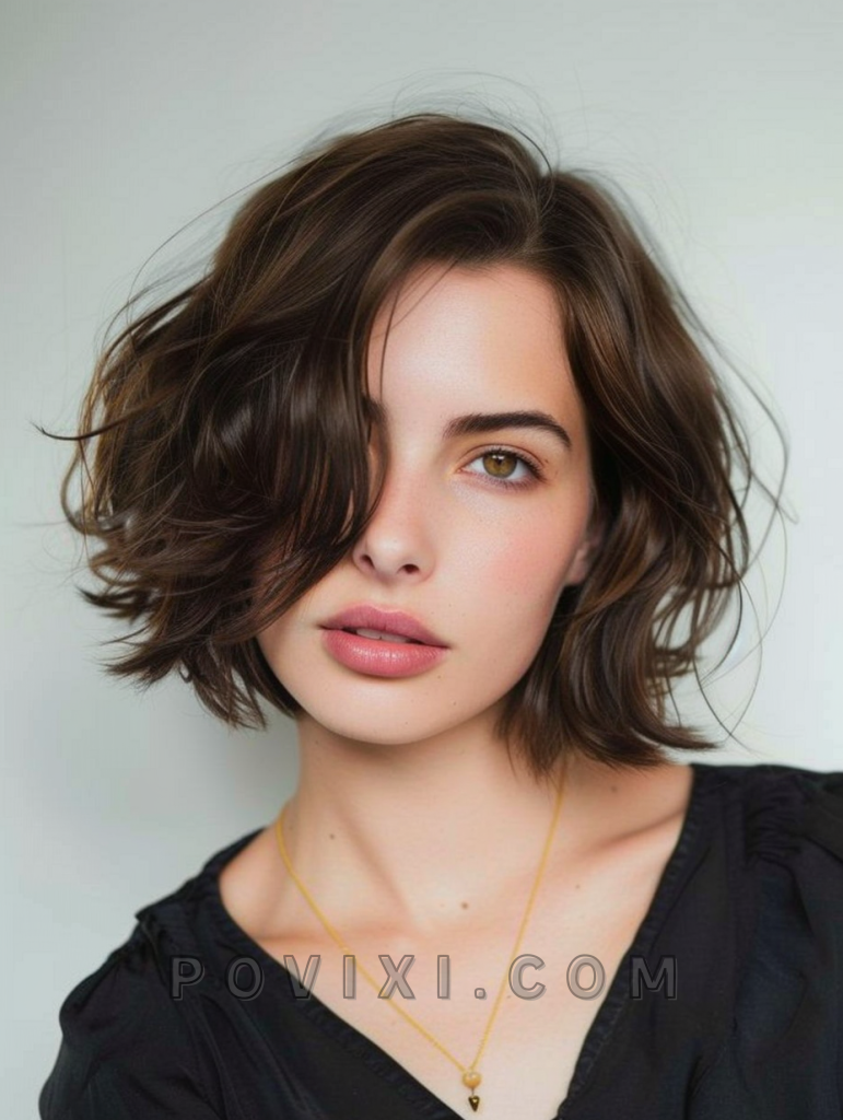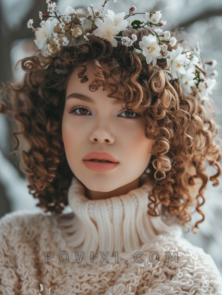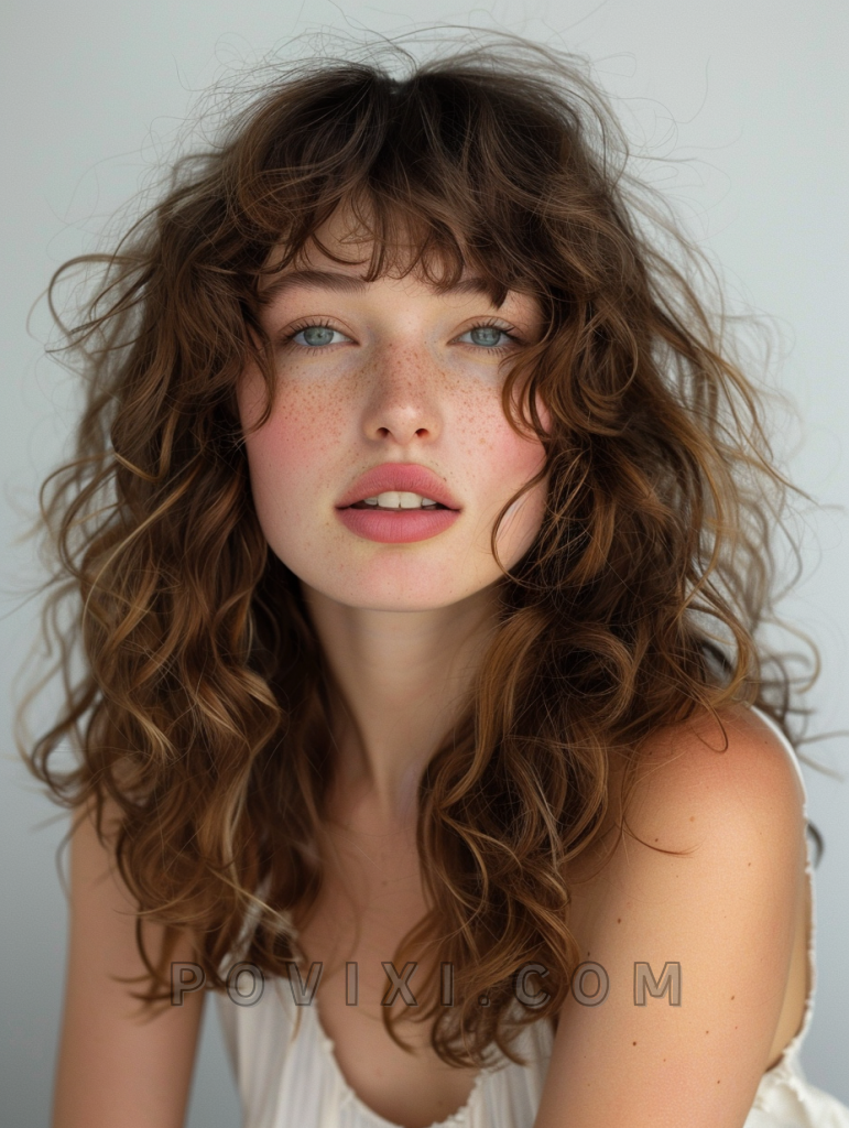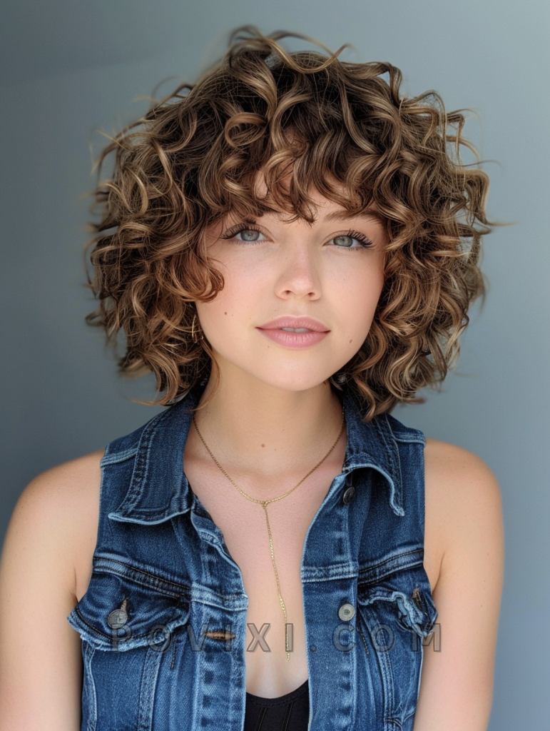 The curly shag with bangs is trendy and edgy, perfect for casual birthday parties or techno nights. It’s best for those with natural curls, suited to short to medium hair, and flatters round and heart-shaped faces.