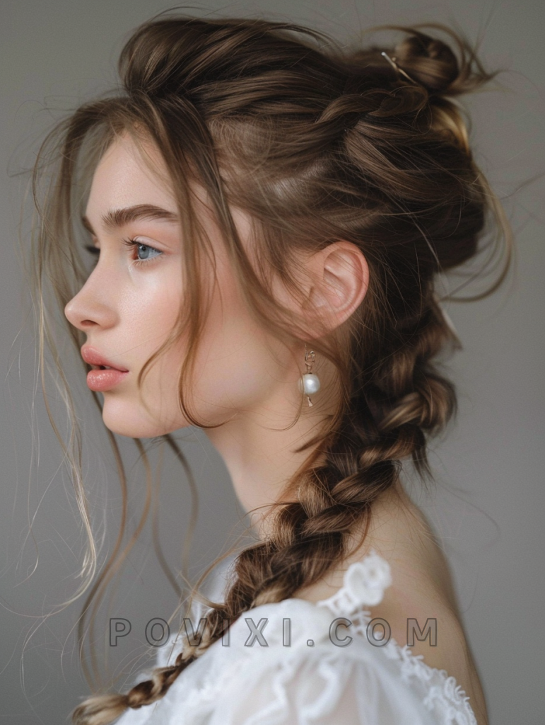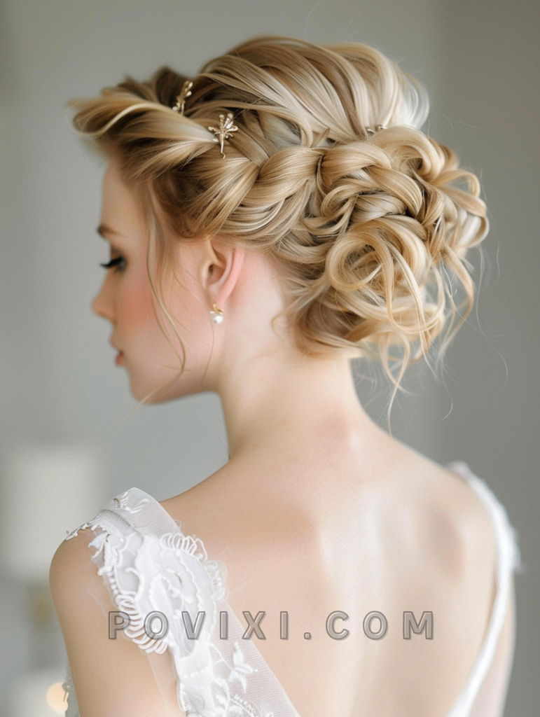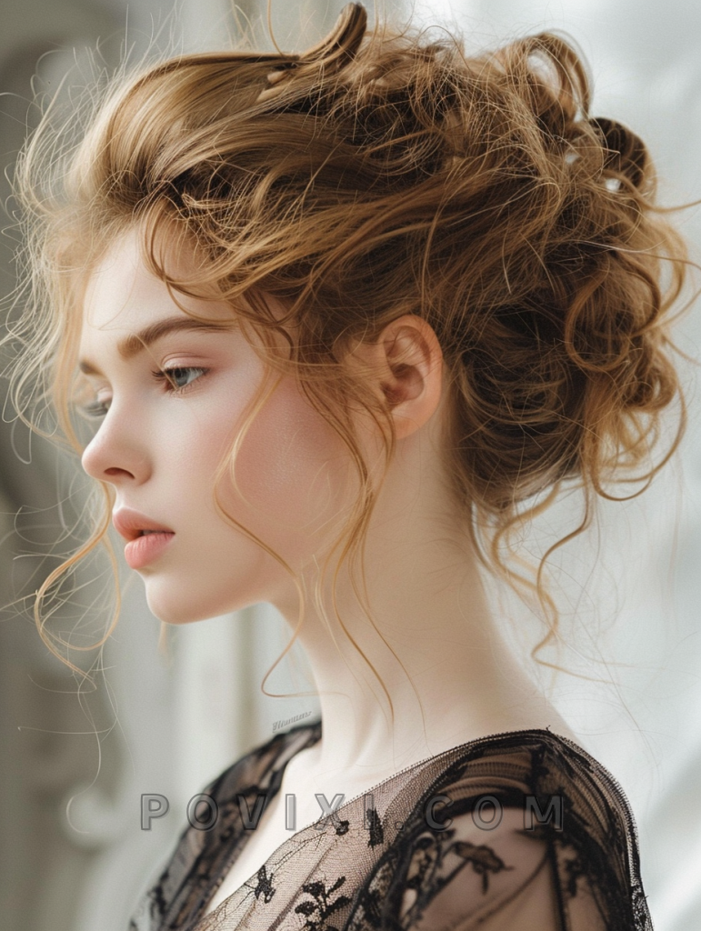Ideal for weddings, holiday parties, or any romantic setting, this tousled updo adds a whimsical charm. It’s perfect for medium to long hair and flatters square and oval face shapes.