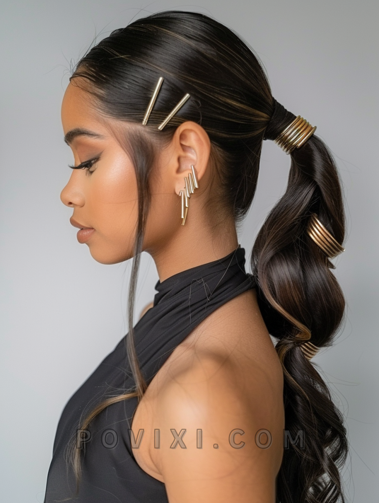 Achieve this look by smoothing your hair back into a low ponytail at the base of your neck. Wrap a metallic thread or a thin, sparkly ribbon around the base to add a touch of elegance. Secure with a strong-hold hairspray to maintain sleekness.
