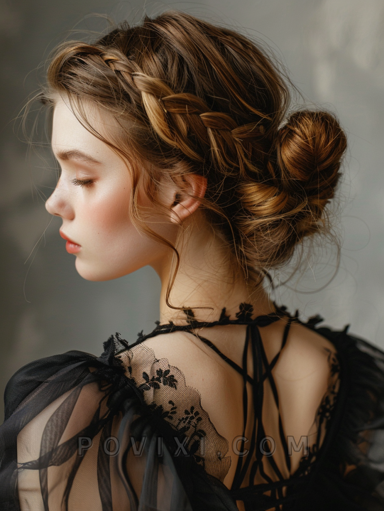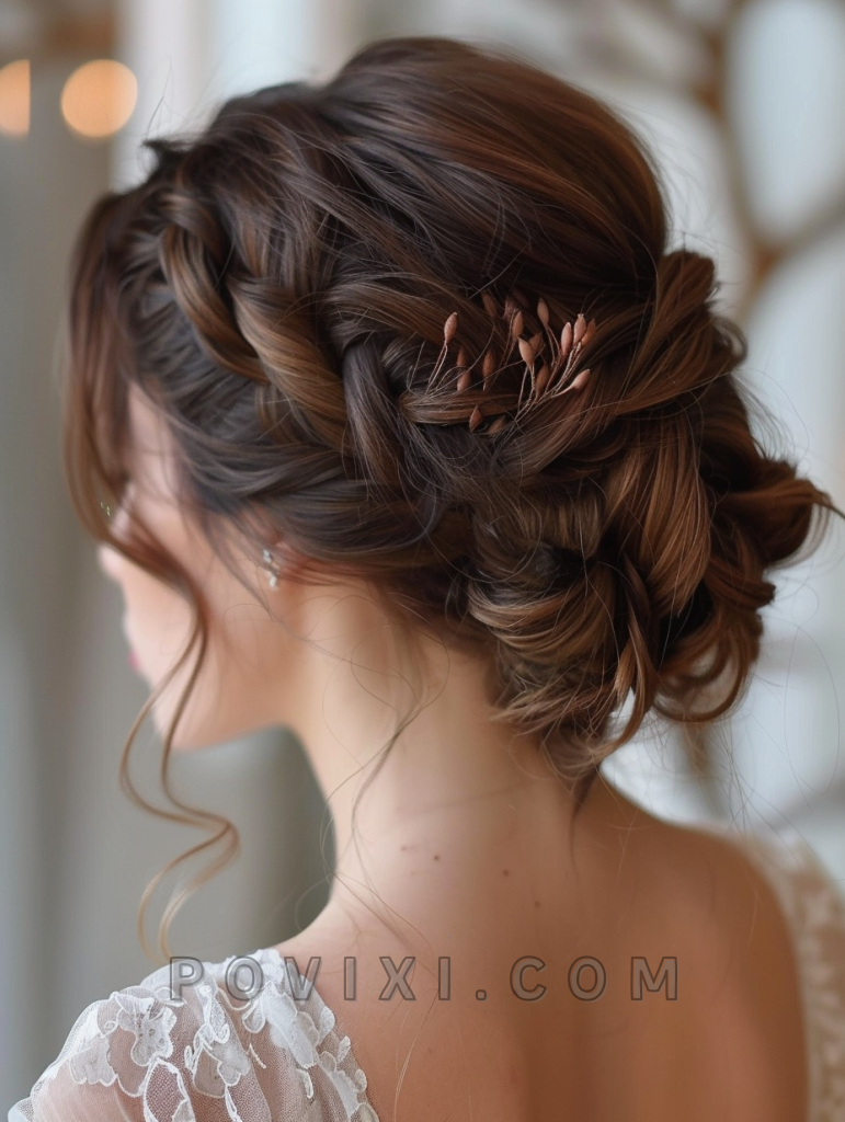 A braided updo brings a touch of romance and sophistication to medium length hair. This style is ideal for weddings or other formal events, fitting well with heart and oval-shaped faces. The braids add texture and depth to the hairstyle, making it a standout choice.