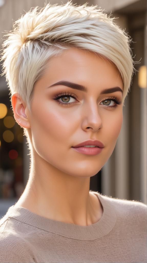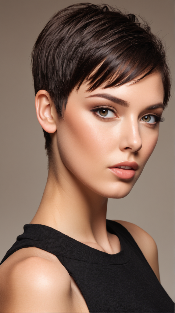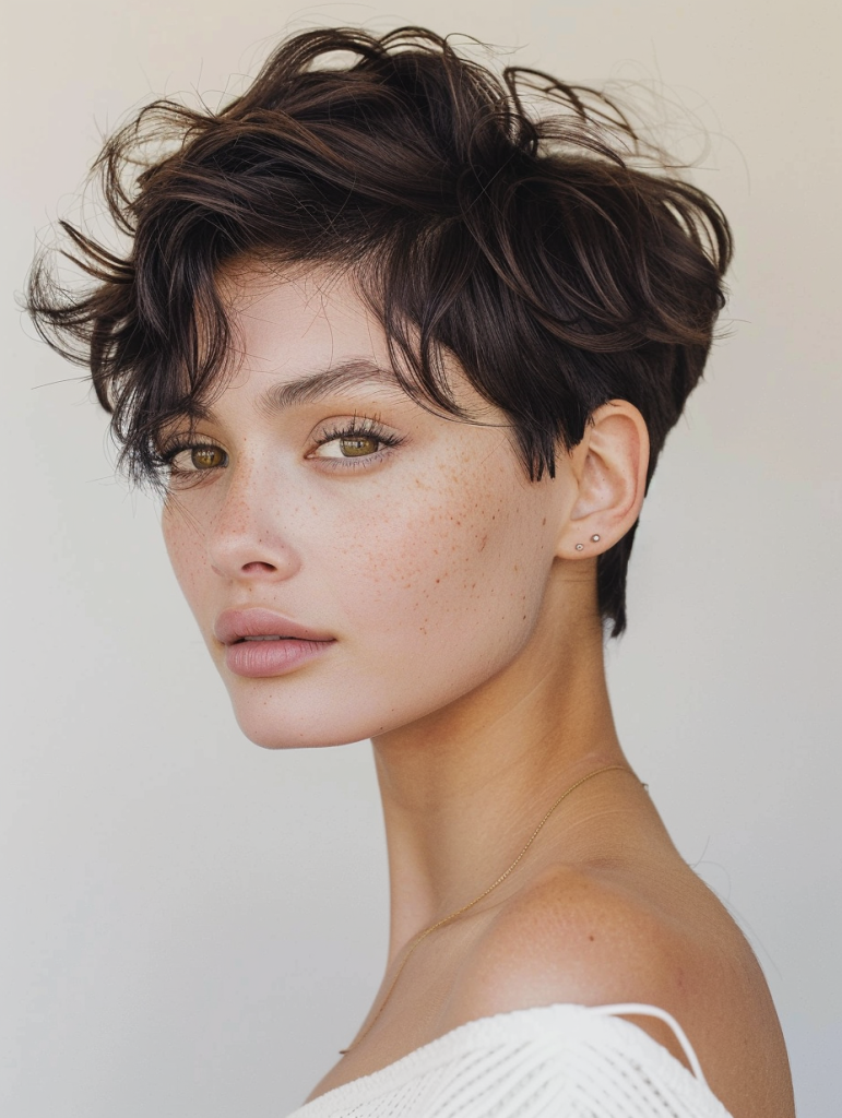 Styling this pixie involves texturizing paste to mold the hair into place, creating a structured yet playful look that stands out in a crowd. Regular trims are necessary to maintain the sharp silhouette of this haircut.