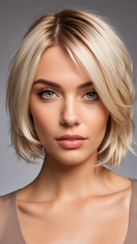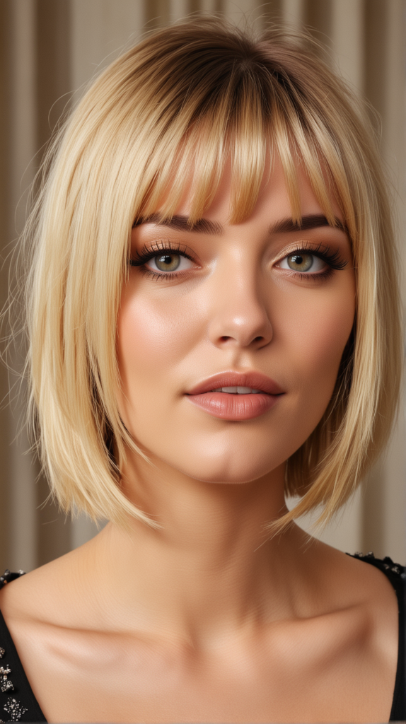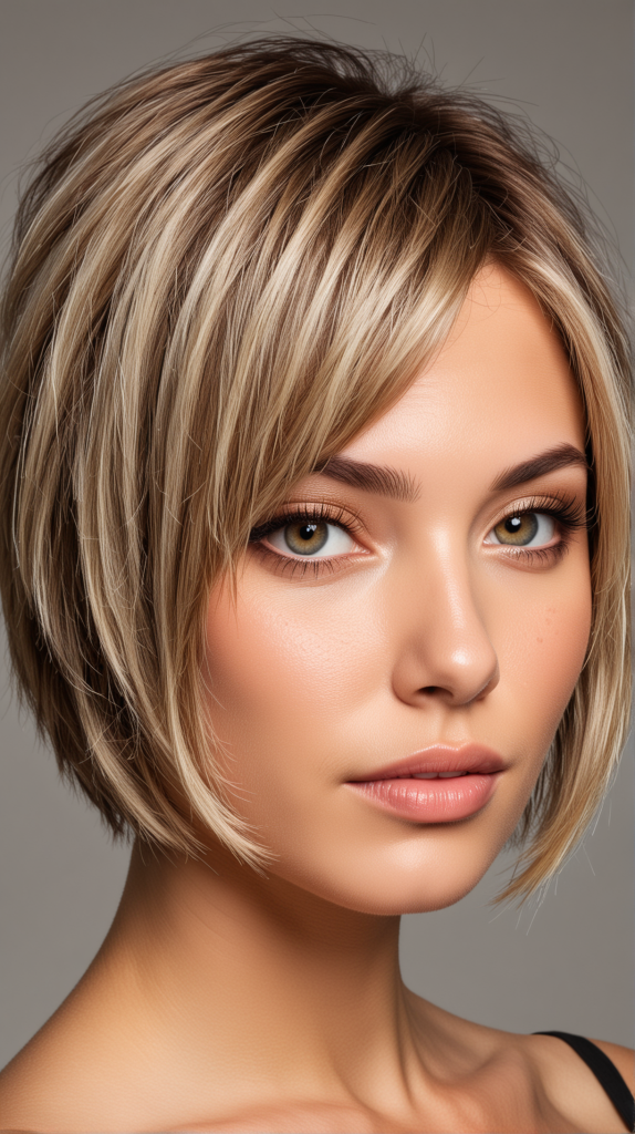 The Classic Butterfly Bob is the epitome of chic simplicity. Suitable for a short hair round face, this style incorporates face framing curtain bangs that soften the facial features, making it an excellent choice for those with more angular faces. It’s perfect for both professional settings and casual outings.