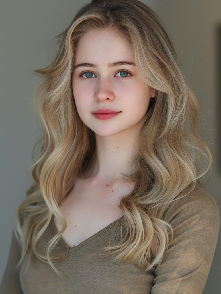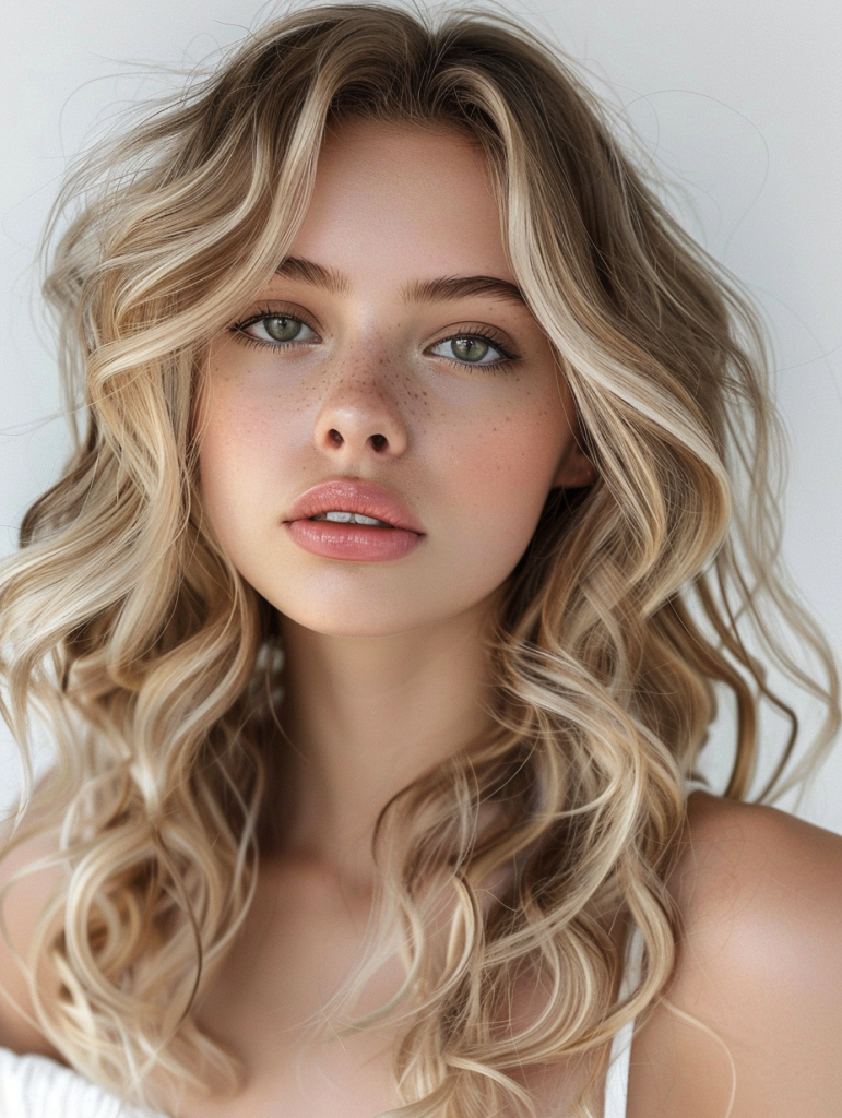 Soft strawberry blonde waves with hidden highlights create a subtle yet stunning visual effect. This style is perfect for those with lighter skin tones and any eye color, offering a gentle enhancement that’s both elegant and understated. It’s ideal for formal occasions or everyday elegance, suiting long and oval face shapes by adding volume and softness.