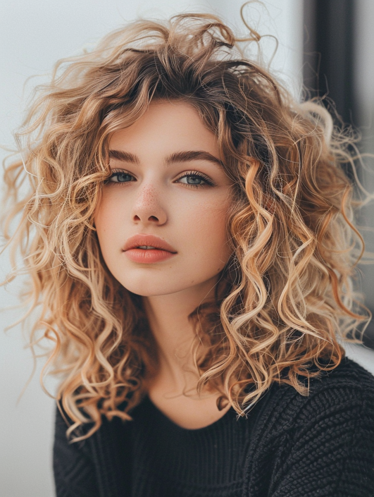 For those with a love for curls, enhancing your natural spirals with blonde highlights can create a romantic and enchanting look. This style works wonders on deeper skin tones and brilliantly accentuates blue and brown eyes. It’s a perfect match for creative or social events and suits triangular and diamond face shapes by adding softness to their angular lines.