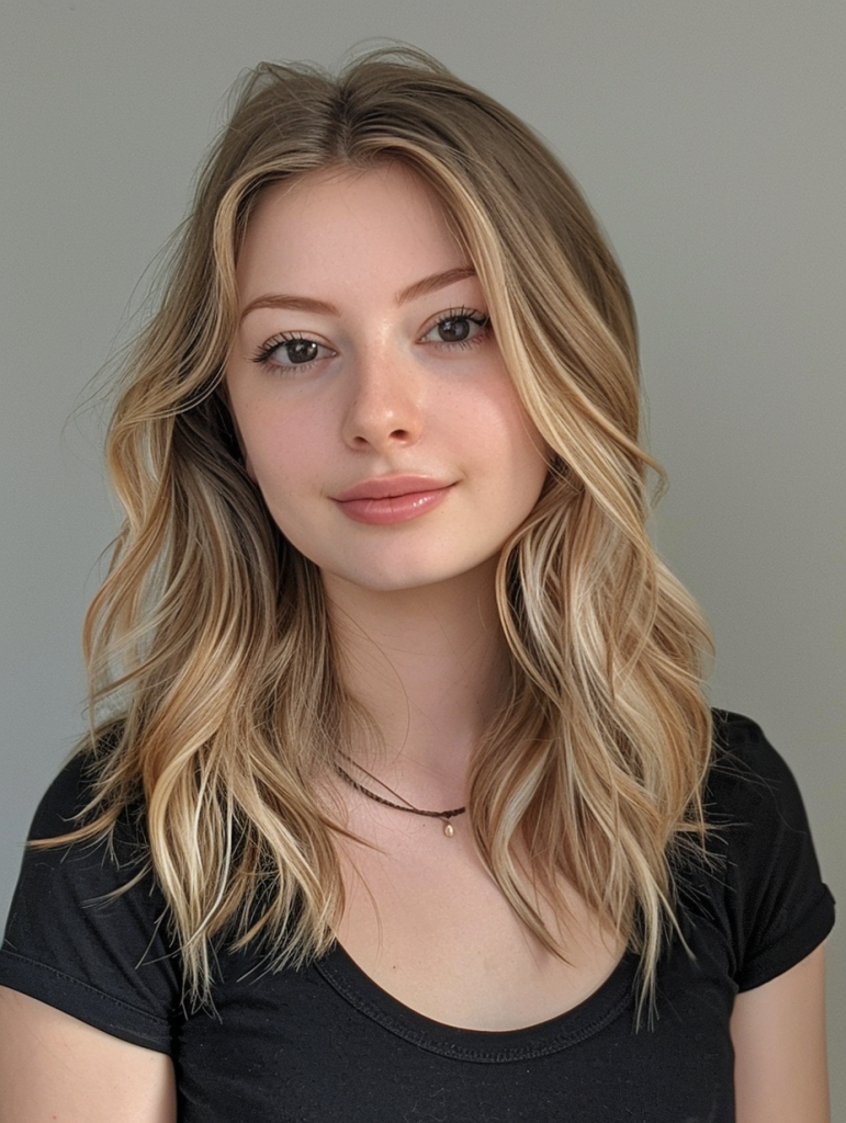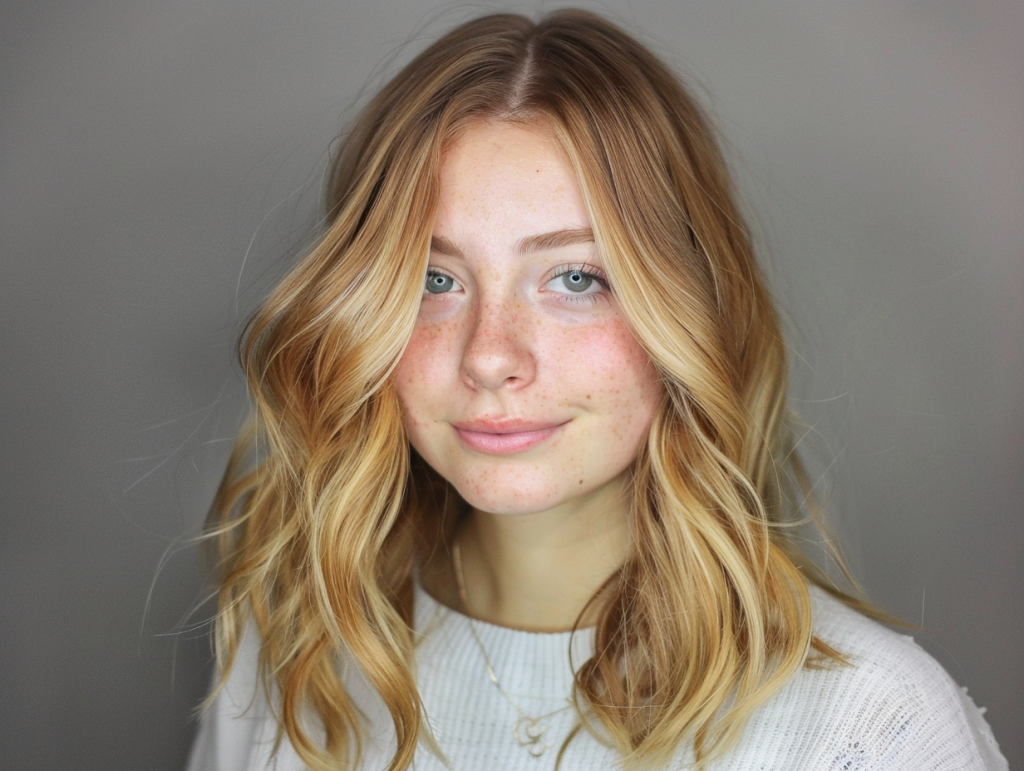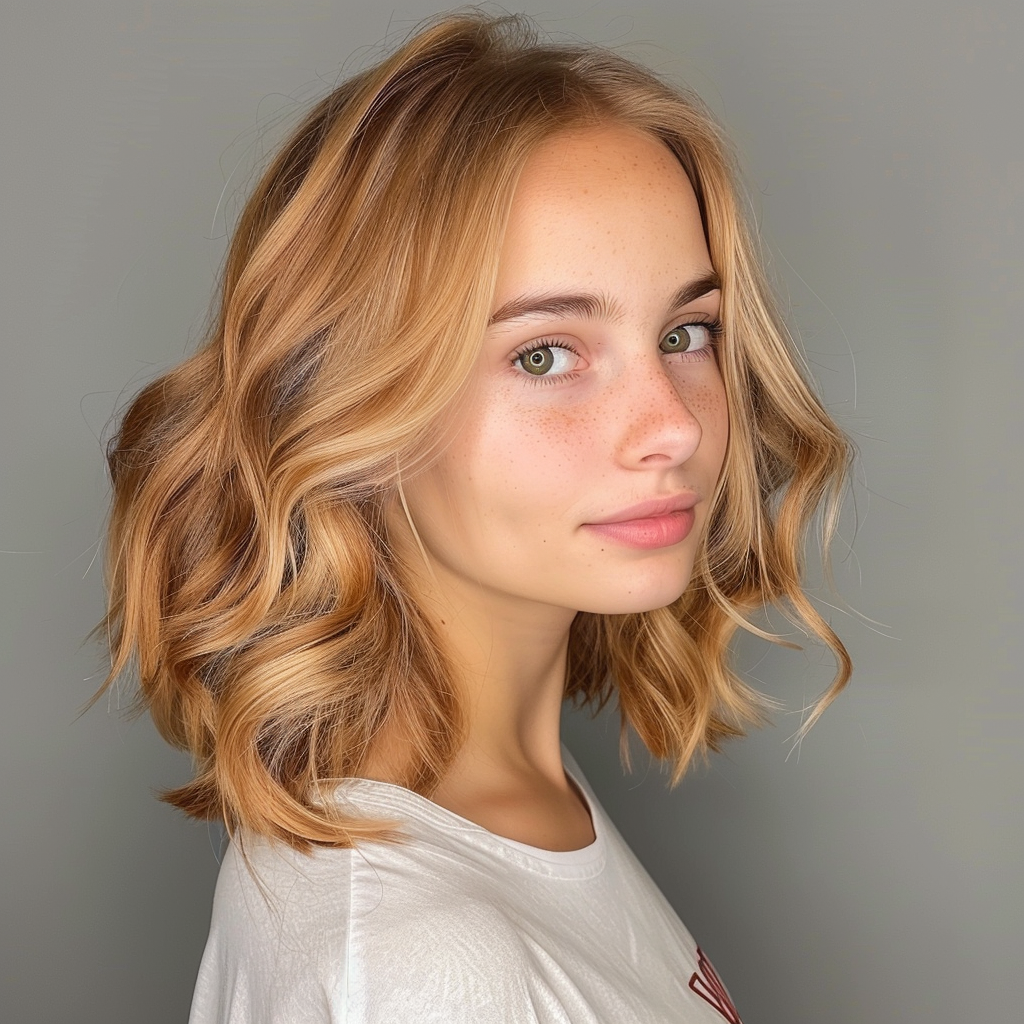 This style combines subtle golden highlights with soft strawberry blonde waves, creating a sun-kissed look that is perfect for any season. Ideal for those with light to medium complexions and light eyes, this hairstyle enhances natural features and adds a touch of elegance. It is versatile for both professional environments and casual outings, and suits oval and round face shapes by adding texture and volume.