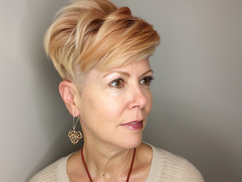 A bold strawberry blonde pixie with a textured top offers a modern, edgy look that’s low-maintenance yet high-impact. This style is especially flattering for those with fair to neutral skin tones and light eyes, accentuating sharp features and adding a youthful vibrancy. Perfect for bold personalities and creative environments, it suits oval and angular face shapes.