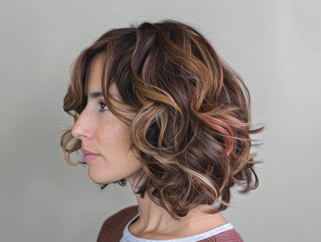 For a casual yet chic look, opt for a curly lob enhanced with light strawberry highlights. This style works best for those with medium to dark skin tones and any eye color, adding a playful twist with curls and bright highlights. It’s an excellent choice for everyday wear or casual social events, beautifully suiting round and heart-shaped faces.
