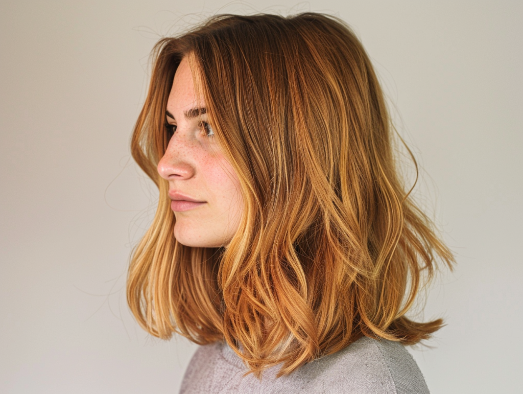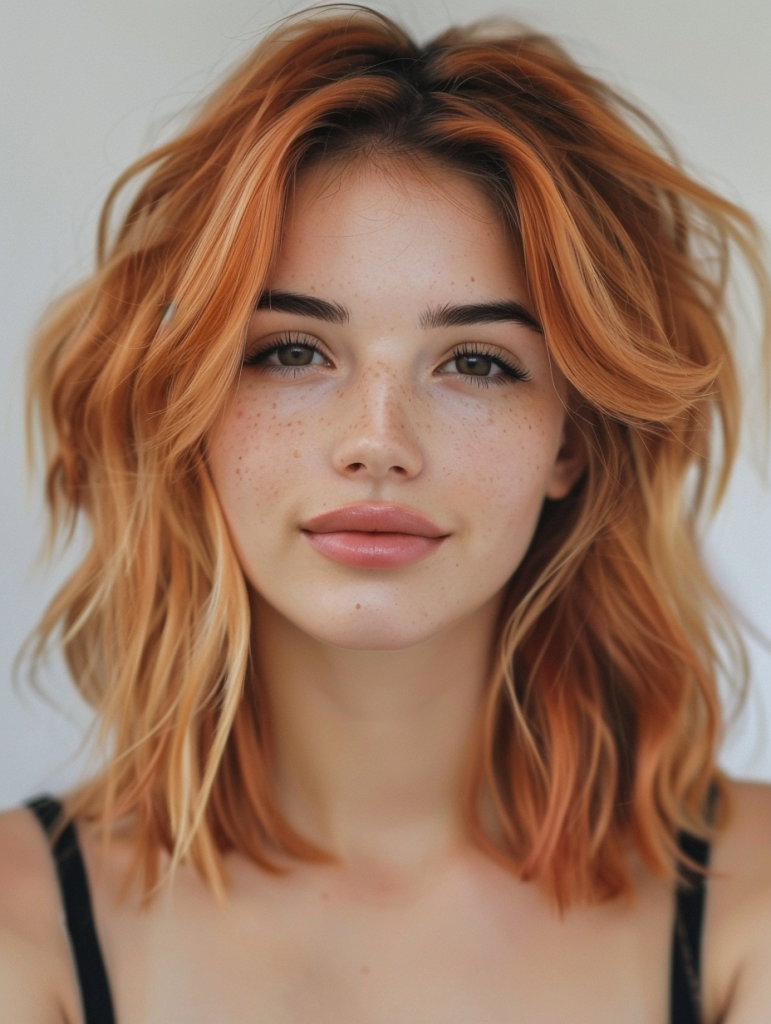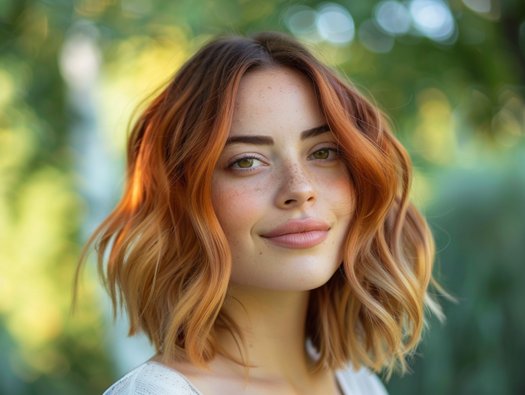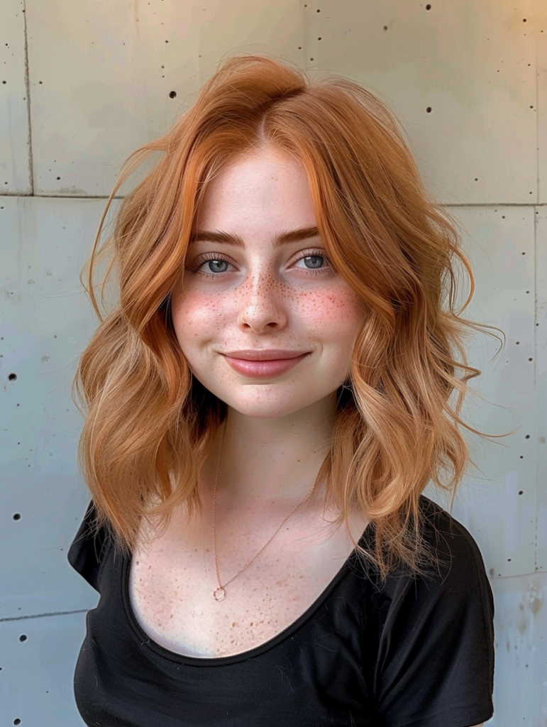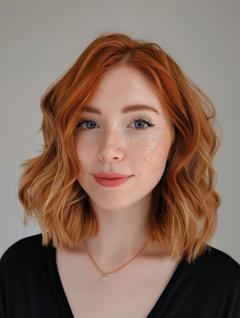 The sun-kissed strawberry lob with beach waves is the epitome of a relaxed, yet stylish look. This hairstyle is exceptionally flattering for those with light to medium complexions and light-colored eyes, giving a youthful and vibrant appearance. It’s perfect for casual outings and beach days, ideally complementing square and diamond face shapes.